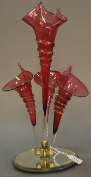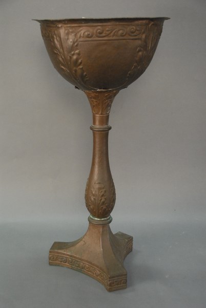 Friedell hand hammered copper floor urn with leaf designs on cup form top set on related shaft on three sided base unsigned attributed to Friedell Pasadena. ht. 33in. dia. 16 3/4in.