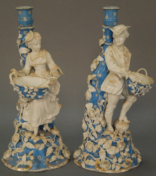 German porcelain candlesticks mounted with male and female figures with baskets and raised three dimensional flowers, late 19th to early 20th century. ht. 14 3/4in.