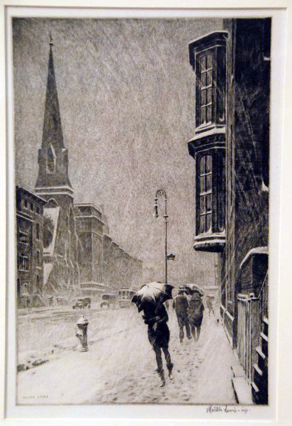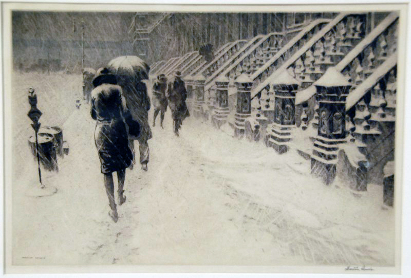 Martin Lewis, N.A. 1881-1962 Stoops in Snow 1930 Drypoint and sandpaper ground McCarron 89.ii 10 x 15 sheet 13 1/2 x 18 1/2 Edition 115 recorded impressions A fine impression printed on white paper with full margins. Laid onto the backing board with linen tape along the sheet edges. Mildew staining in the top and left margins, outside the image. Slightly toned. Original Frederick Keppel & Co. label, verso. Signed in pencil lower right Martin Lewis