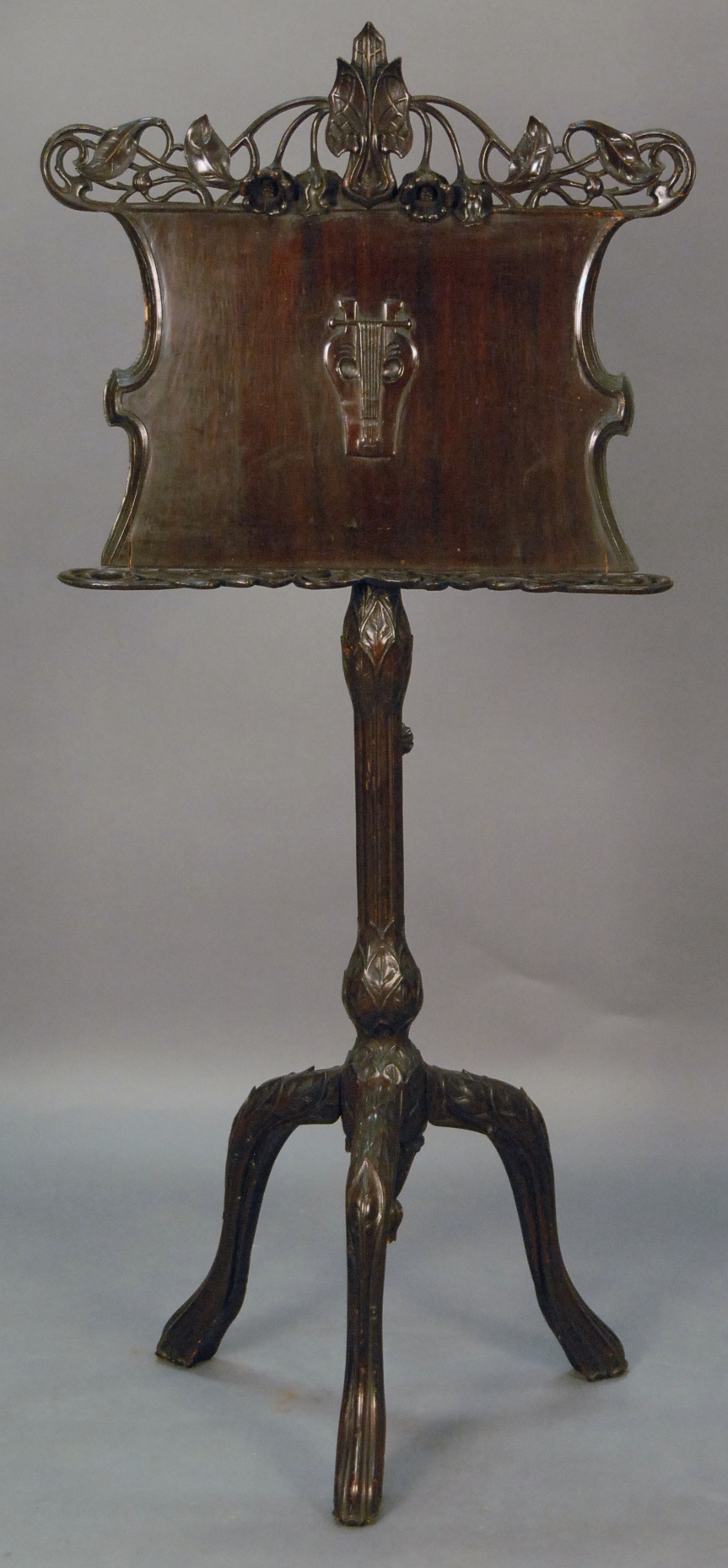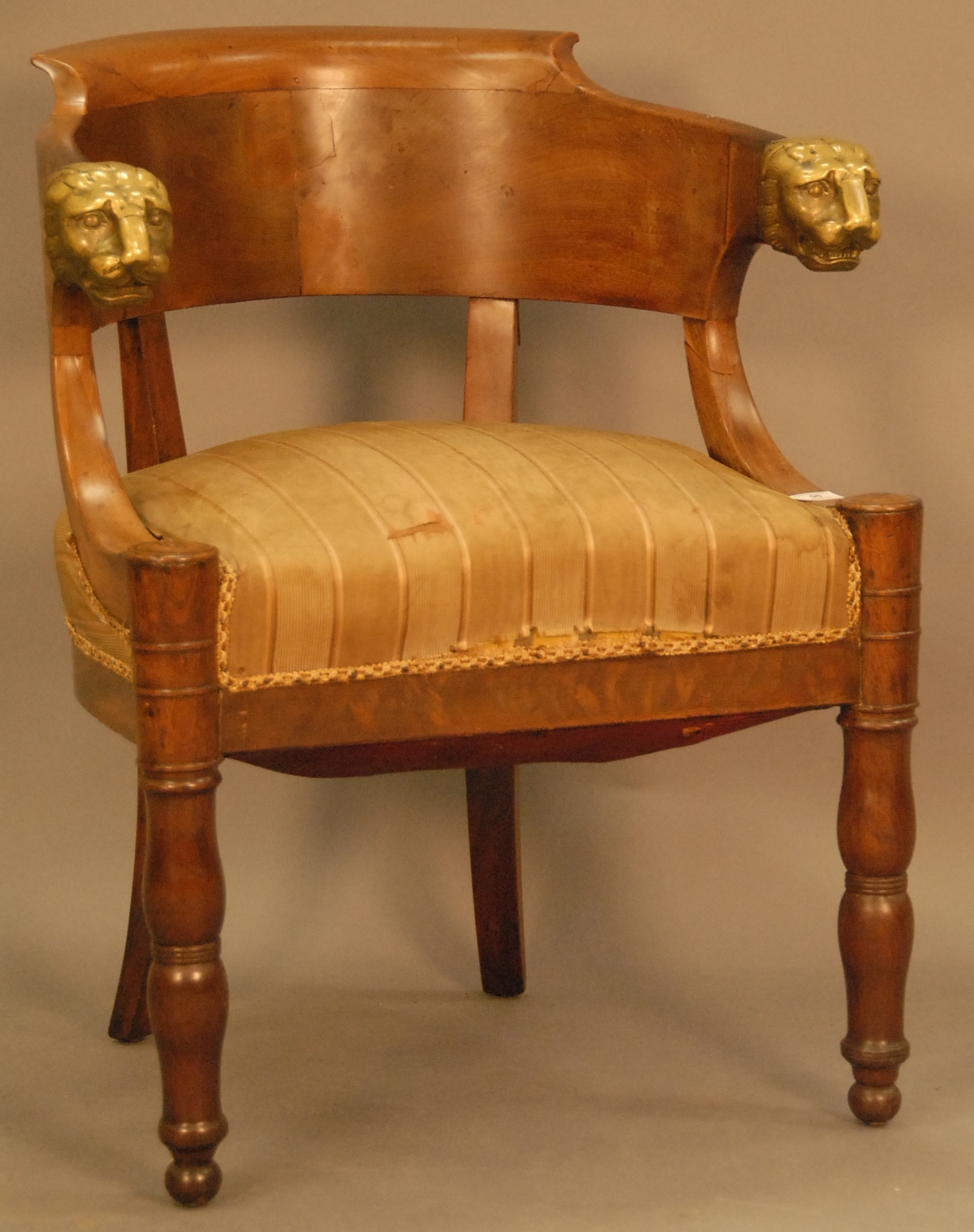 Continental mahogany armchair barrel back extending to arms with large bronze lion heads, upholstered seat all set on turned legs, 19th century back repaired.