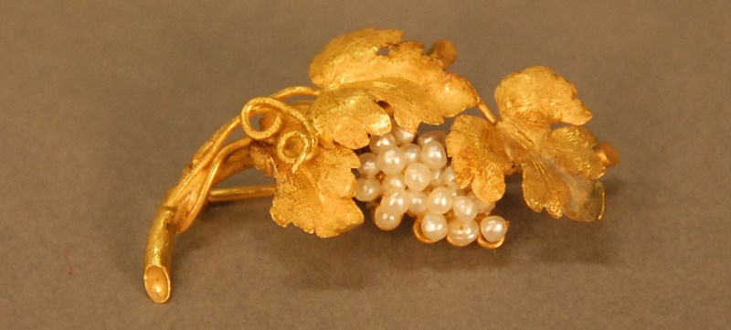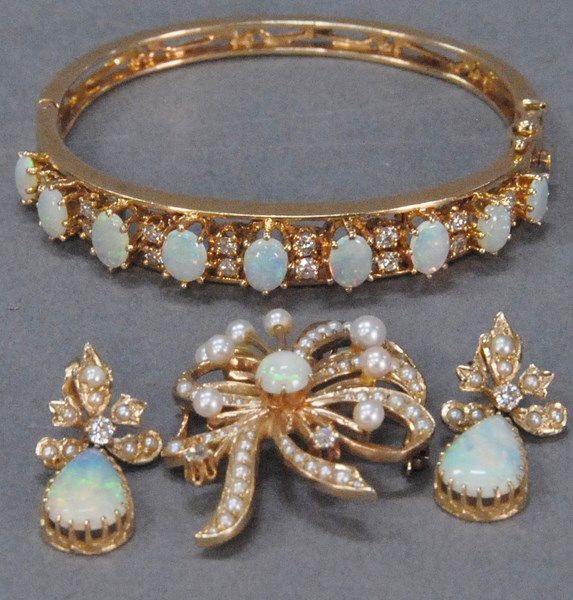 Four piece lot to include 14K yellow gold, opal and diamond bracelet having nine oval opals and 16 round diamonds, marked JGJLRY. 23.5 grams Pair of 14K yellow gold, opal, diamond, and pearl drop earrings, each having eight small seed pearls, one small diamond, and tear shaped opal. 5.5 grams and 14K yellow gold, pearl, opal and diamond brooch having 57 pearls, two diamonds, and one center opal one pearl missing. 10.1 grams. total weight 39.1 grams
