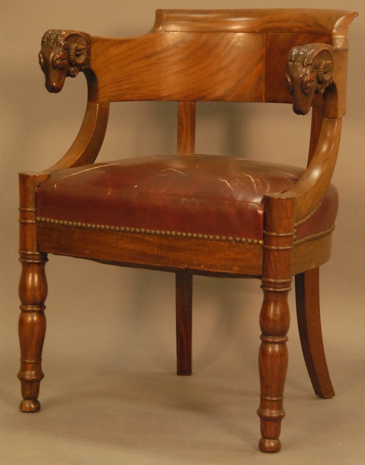 Continental mahogany armchair, barrel back extending to arm with large carved ram’s heads, leather upholstered seat, all set on turned legs, 19th century.