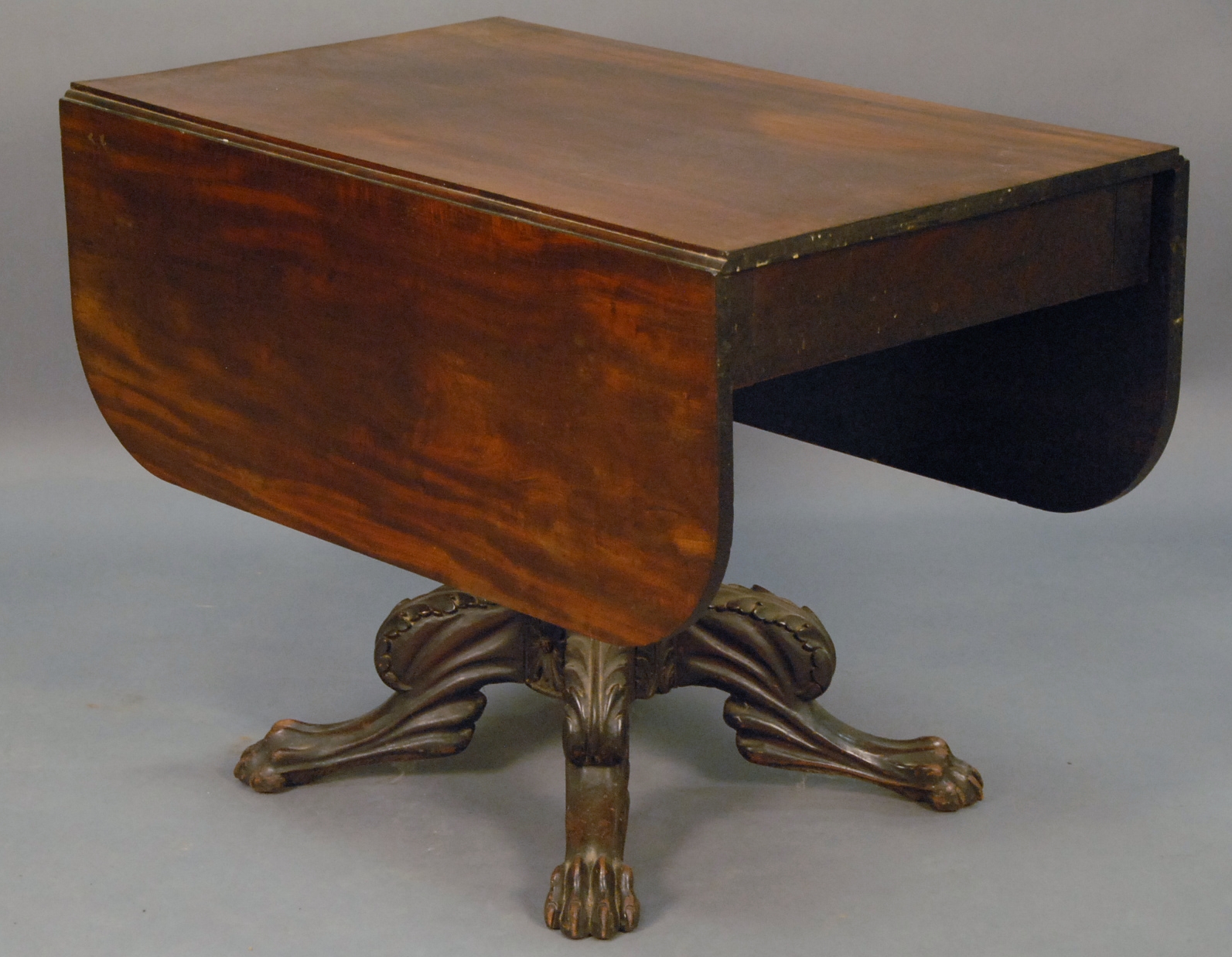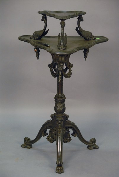 Elaborate Continental ebonized mahogany dolphin carved two tier dessert serving table having double triangular shelves over a fancy carved pedestal with three elaborate arch carved legs, 19th century. ht. 39in.