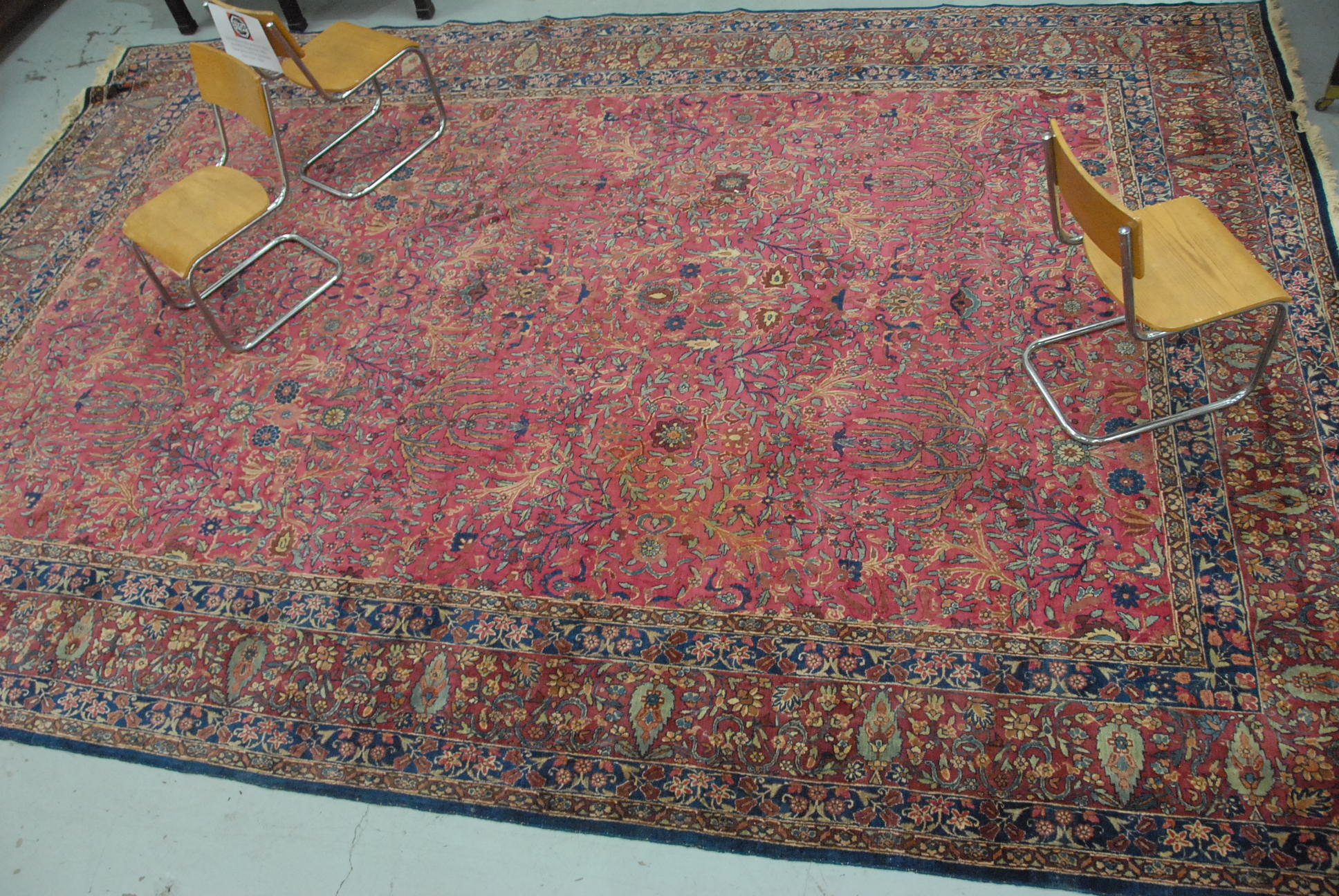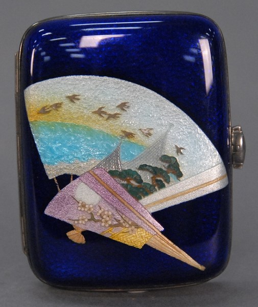 Silver enameled cigarette case with scenic Japanese style hand fans, cobalt blue with pink, gold, white, green, and light blue. ht. 3 3/4in. wd. 2 3/4in.