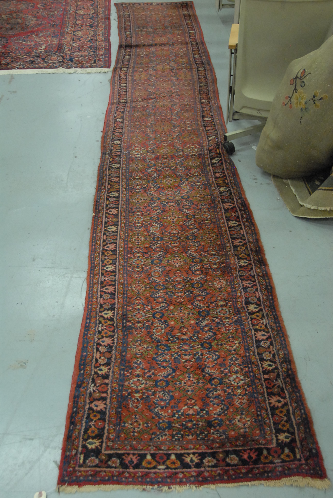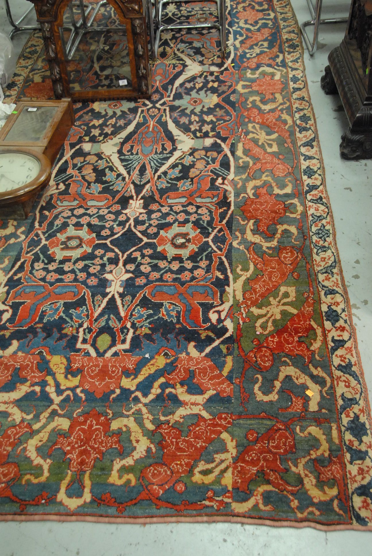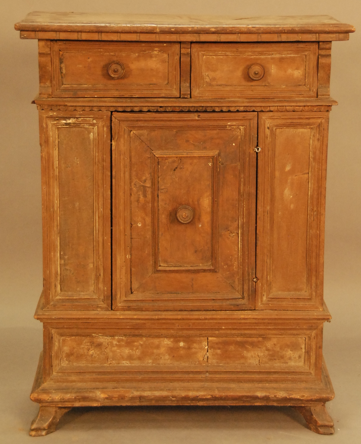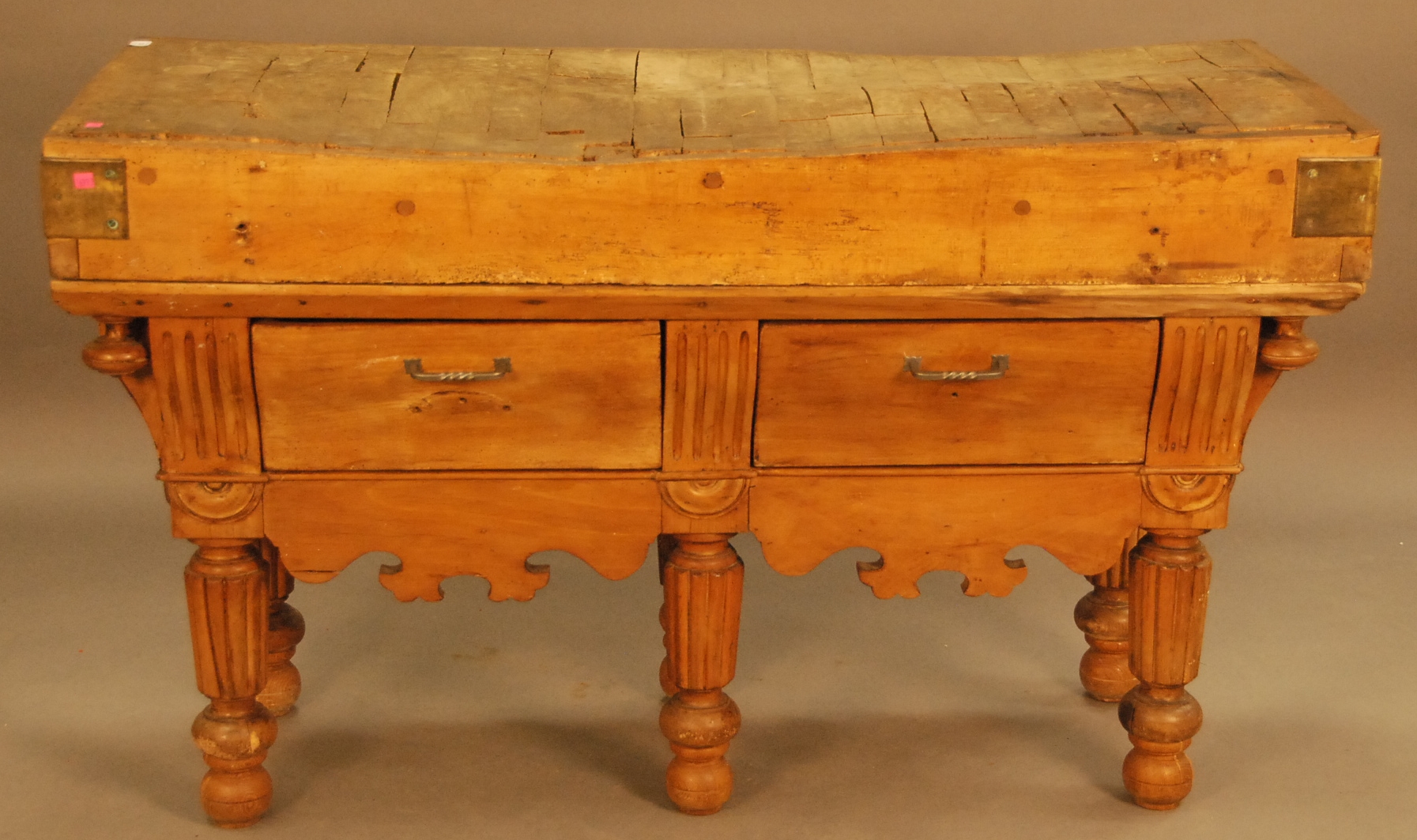 Large hardwood butcher block with rectangular top, sides reinforced with brass brackets, on base with two drawers, scalloped apron and turned and fluted legs, 19th century, probably Continental. top: 28 x 58 ht. 35in.