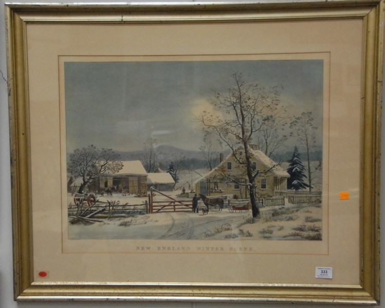 Currier and Ives 1813-1888 NEW ENGLAND WINTER SCENE lithograph marked lower left Painted by Geo. H.D. marked lower right Lith Currier & Ives NY 19 3/4 x 26 1/8 paper size 18 1/2 x 24 3/4 sight size