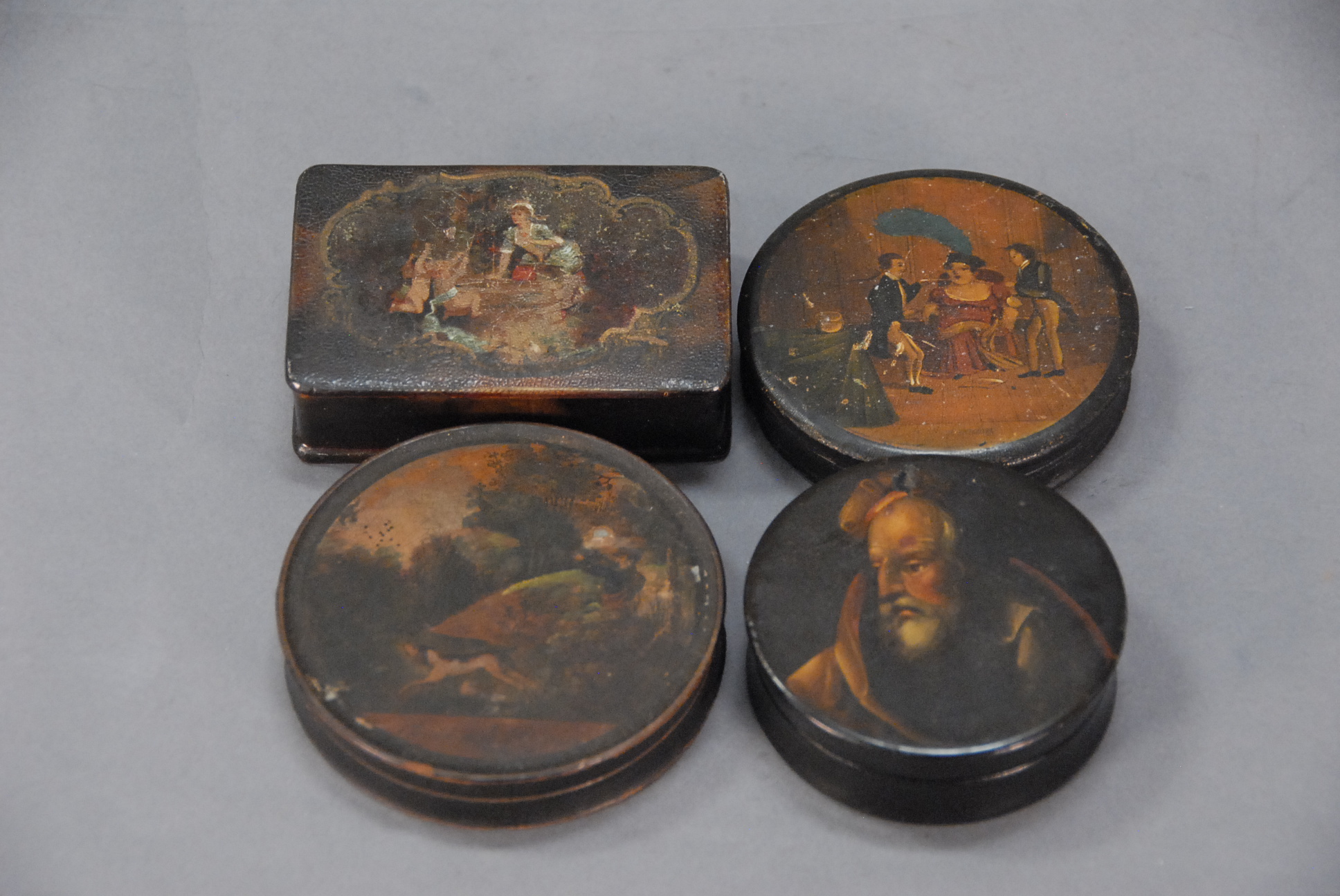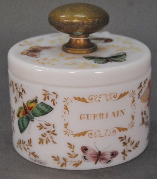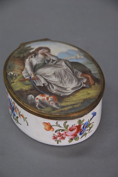 Battersea enameled oval box, top with reclining woman with King Charles dog top with small chip and hair lines. Provenance: Arthur Vernay, N.Y. top: 3 1/2 x 5