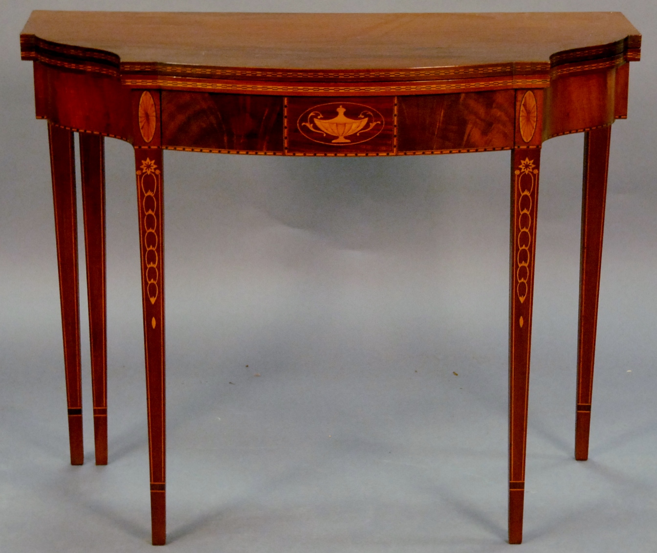 Fineberg mahogany games table having shaped top over conforming frieze with drawer all set on square tapered legs with oval, floral, and urn inlays. ht. 29in. wd. 36in.