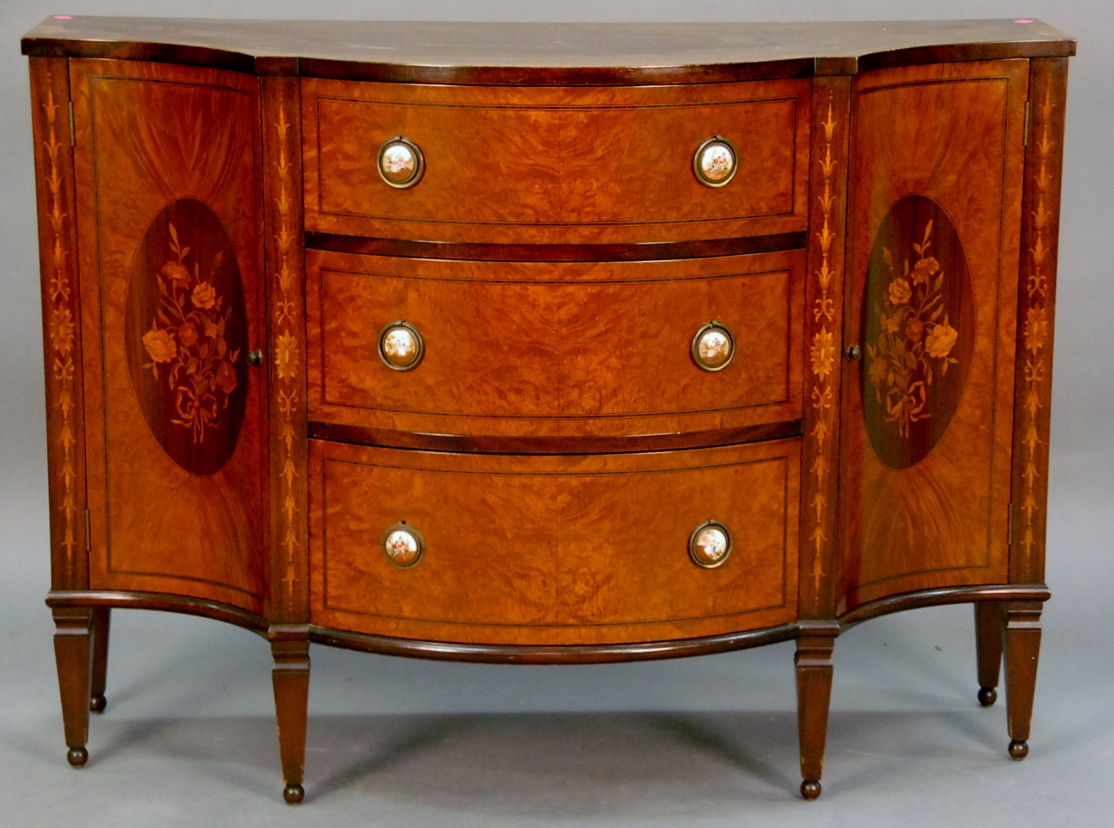 Gerte custom mahogany inlaid server with shaped top over conforming case, front with burlwood veneer and inlaid flowers and porcelain pulls signed in drawer Joseph Gerte Boston. ht. 35 1/2in. wd. 48in.