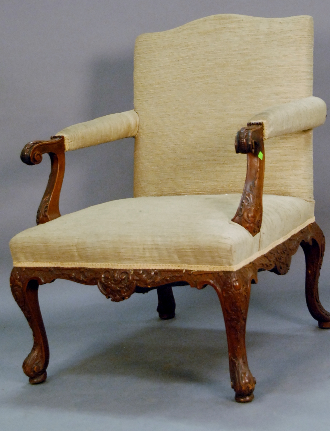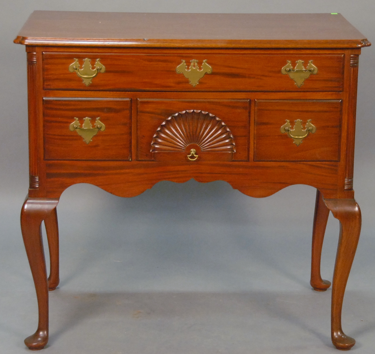 Margolis mahogany Queen Anne style lowboy having rectangular top over one long drawer over three short drawers on cabriole legs ending in pad feet. ht. 31 1/2in. wd. 32in.