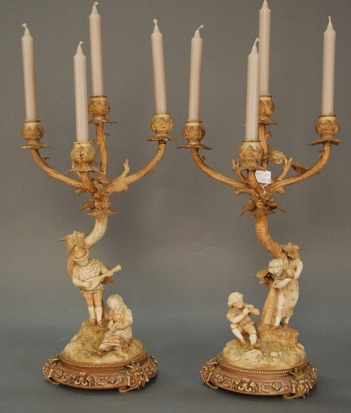 Pair of Hadley Royal Worcester candelabras with figural bases, each with four lights and round bases with faces, both as is – each missing arm plus minor chips. ht. 23in.