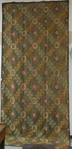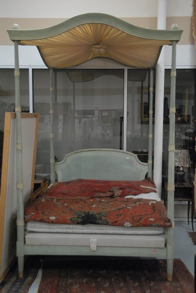 Louis XVI style canopy bed, green with light green trim having fluted and carved posts with turned and fluted legs. 59 x 78 1/2 inside rails ht. with canopy 8ft. 8in.