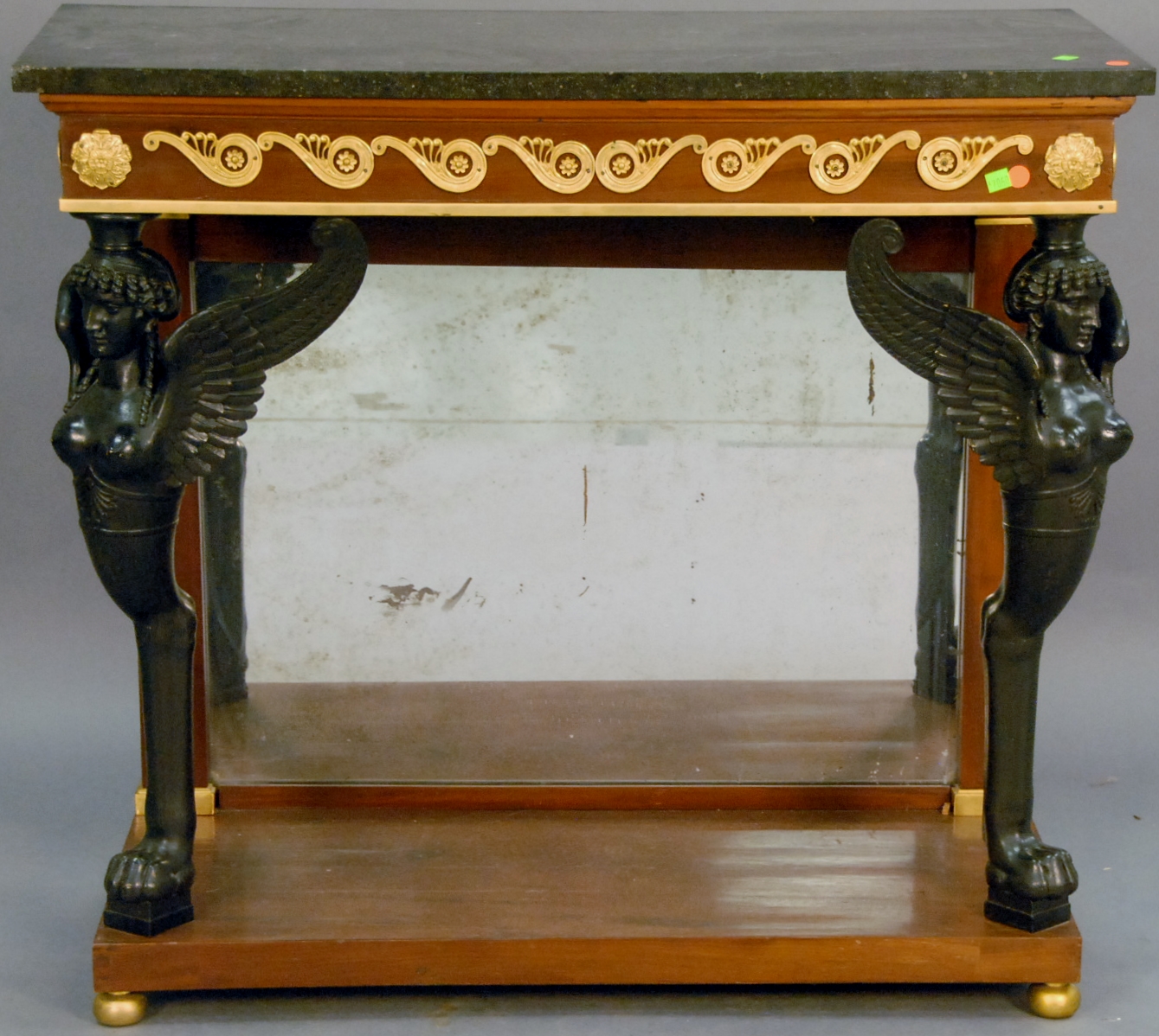 French Empire style console having granite top over mirrored back and gilt bronze mounted frieze on carved figural winged supports with paw feet on plain base with gilt bronze ball feet. ht. 35in. wd. 38 1/4in. dp. 18in.