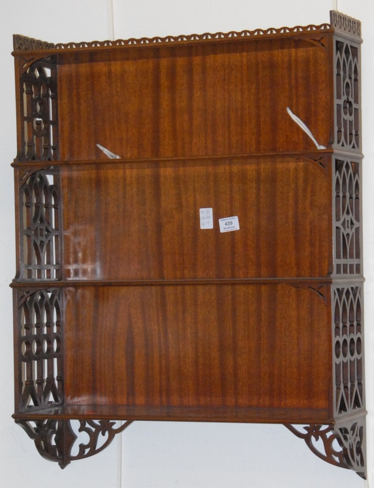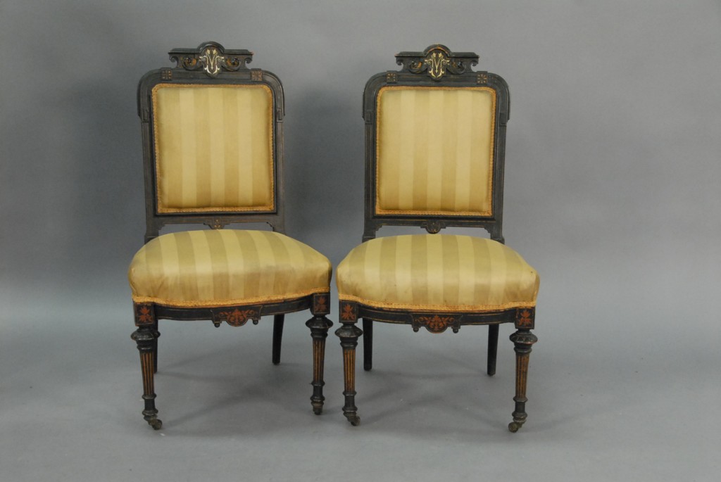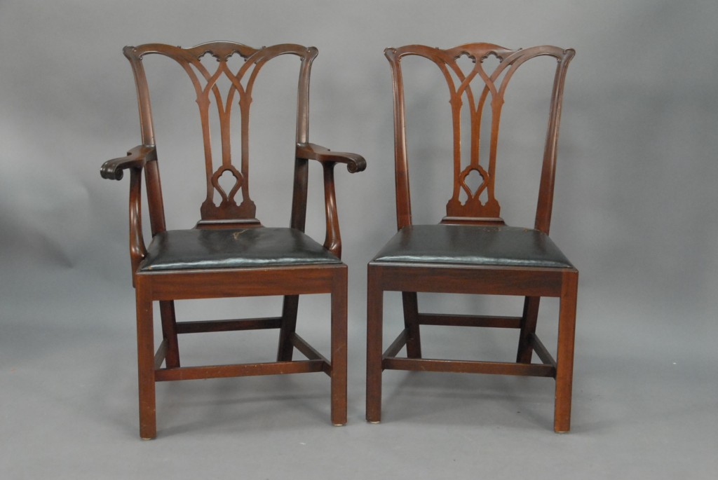 Margolis set of six Chippendale style dining chairs marked with brass plaques, Margolis 1927, two armchairs and four side chairs all with original black leather seats.
