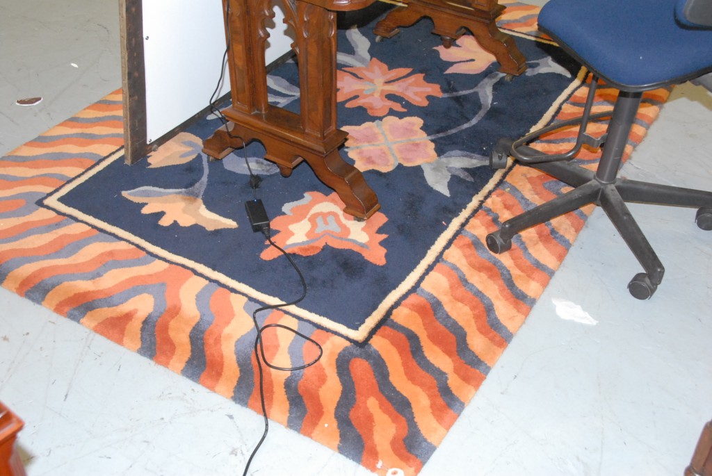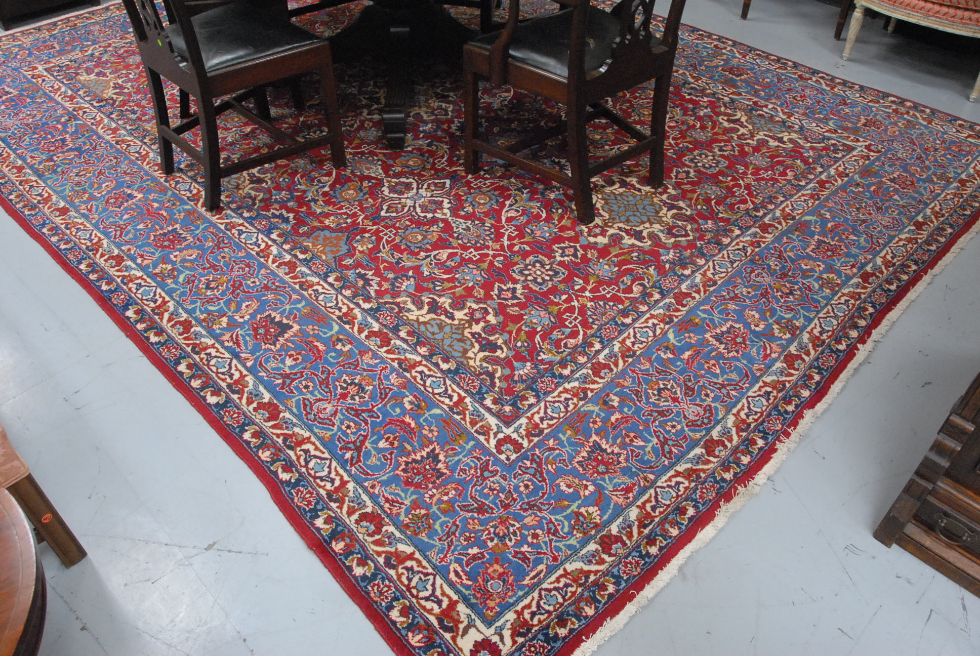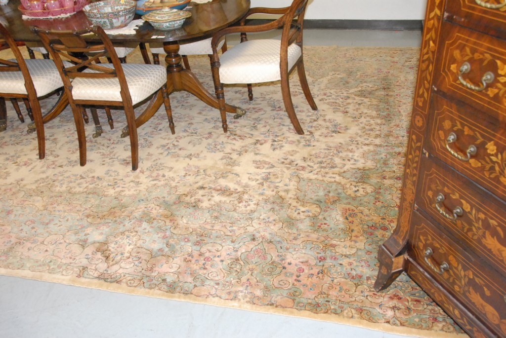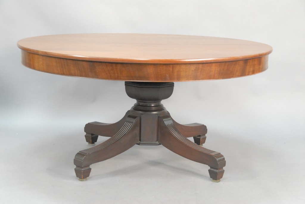 Margolis mahogany round dinging table with large pedestal base with drop down center legs and rack of five 12in. leaves. height 30in. diameter 5ft. opens to 120in.