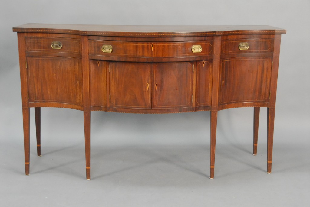 Margolis mahogany sideboard, Hepplewhite style with shaped top over conforming case of three drawers over two center drawers flanked by bottle drawers flanked by doors all with line inlays. height 41 1/2in. width 72in. depth 28in.