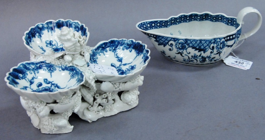 Two piece lot: A Worcester shell pickle stand modeled as three scallop shell dishes set on a triangular coral base applied with shells rising up in the center to a larger shell handle, the interior of the dishes painted in blue with the Sweetmeat Stand Rose pattern, comprising mixed sprays including central roses, circa 1760 – 1770. ht. 4 1/2in., wd. 8in. and A Worcestershallow fluted sauceboat painted in blue with The Full Moon pattern, the exterior with an elaborate lambrequin border, circa 1775-1780. ht. 3in., lg. 8in.