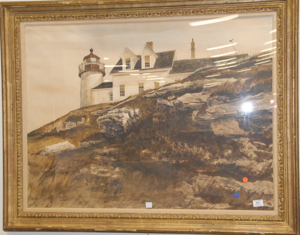 John Wesley Chumley 1928-1984 The Lighthouse watercolor on paper signed lower left Chumley Hirschl & Adler Gallery label on back and Maynard Walker label on back 30 x 40