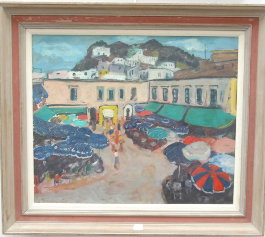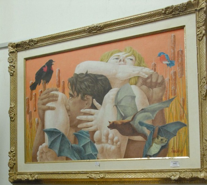 Vincent T. Smarkusz 1919-1974 two paintings one is circular of men and women oil on board signed lower left Smarkusz diameter 17in. And one is man with seagulls signed lower left Smarkusz 13 x 21