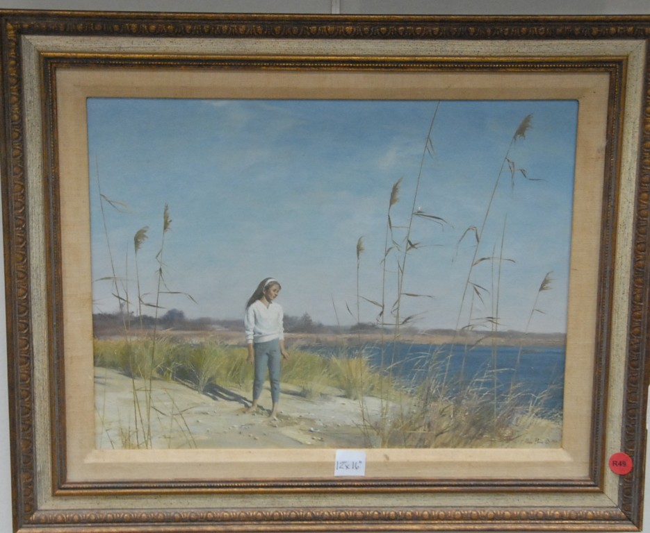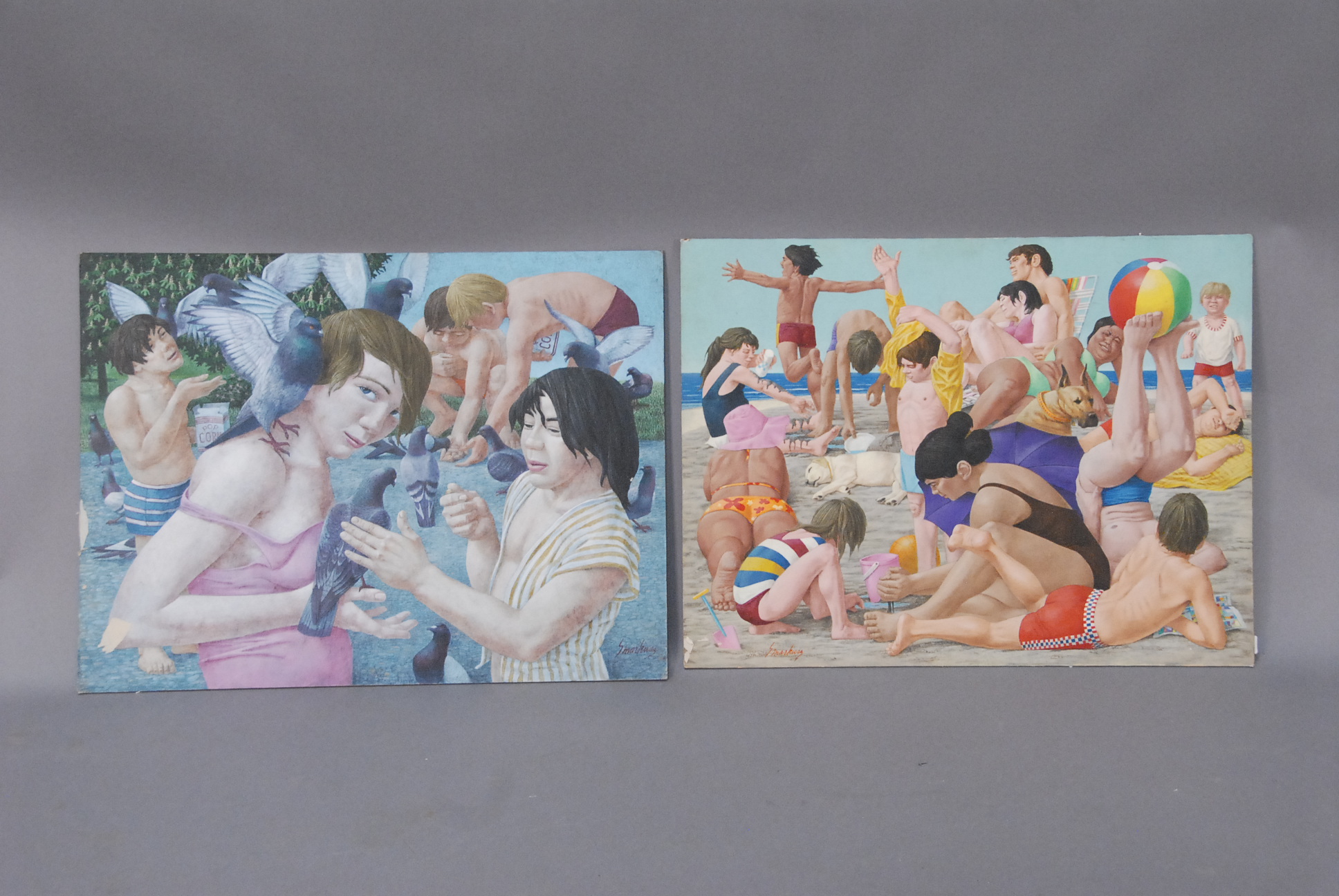 Vincent T. Smarkusz 1919-1974 two paintings Beach oil on board signed lower left Smarkusz 24 x 32 and People with Birds oil on board signed lower right 24 x 32