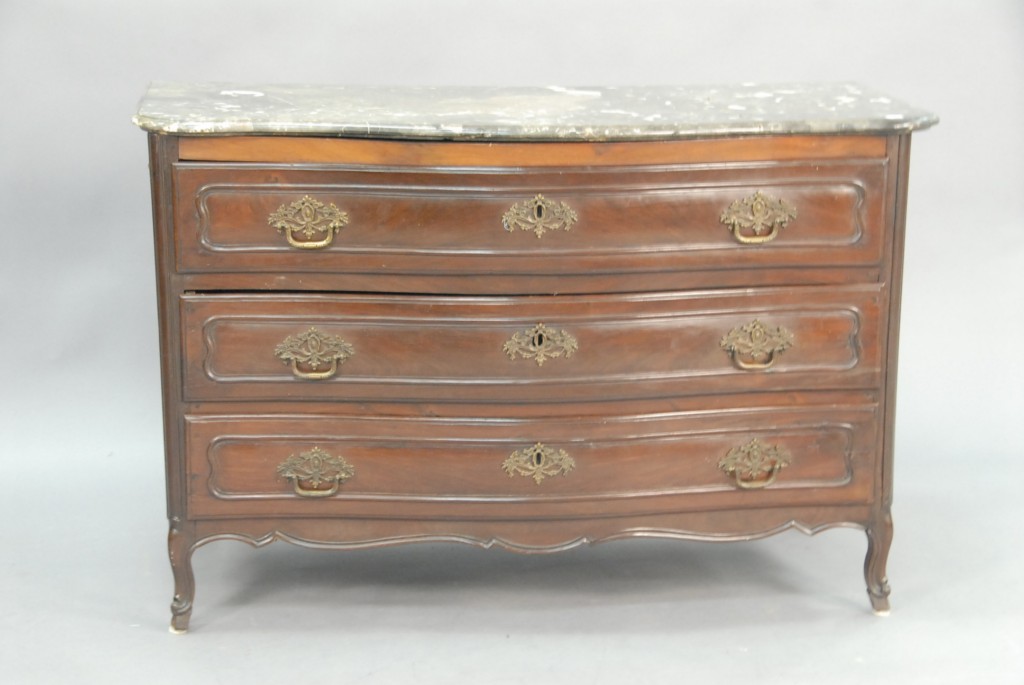 Louis XV commode, mahogany with grey marble top and three drawers set on cabriole legs, early 19th century marble repaired. height 33in. length 51in. diameter 24in.