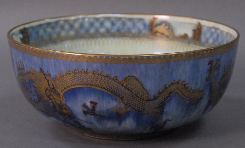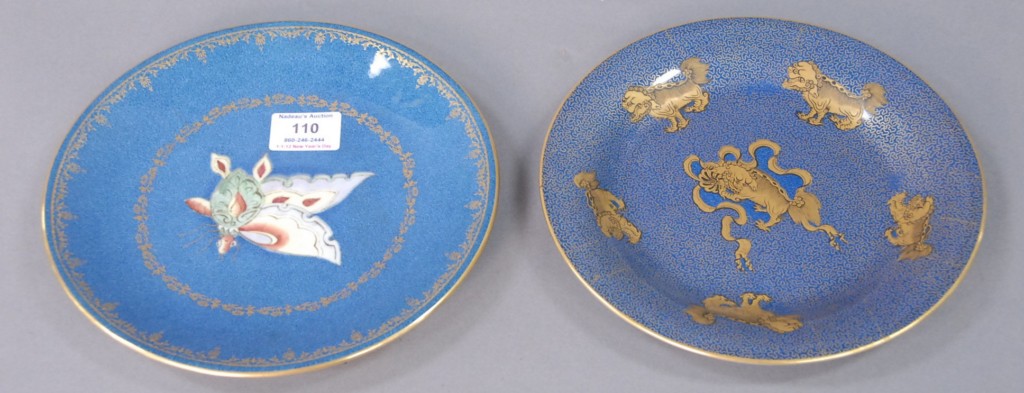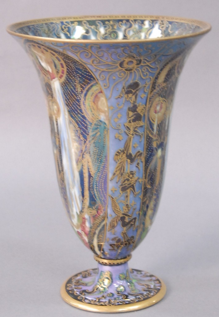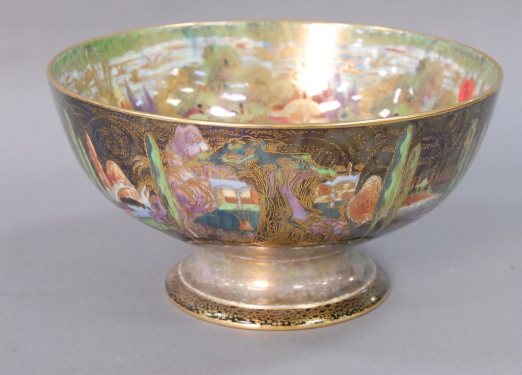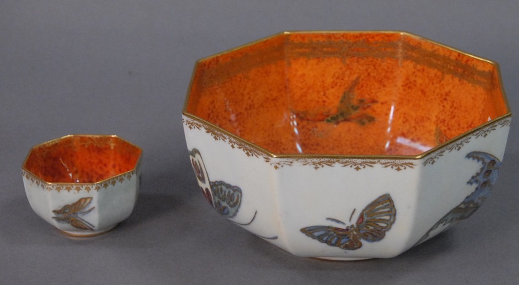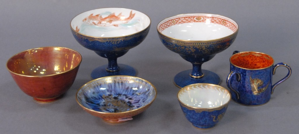 Six piece Wedgwood lot two stemmed cups, numbered Z14635 and Z4229, five Wedgwood Fairy Luster pieces a three handled cup, two tea cups, and one saucer. Largest cup height: 3in. diameter 4in.