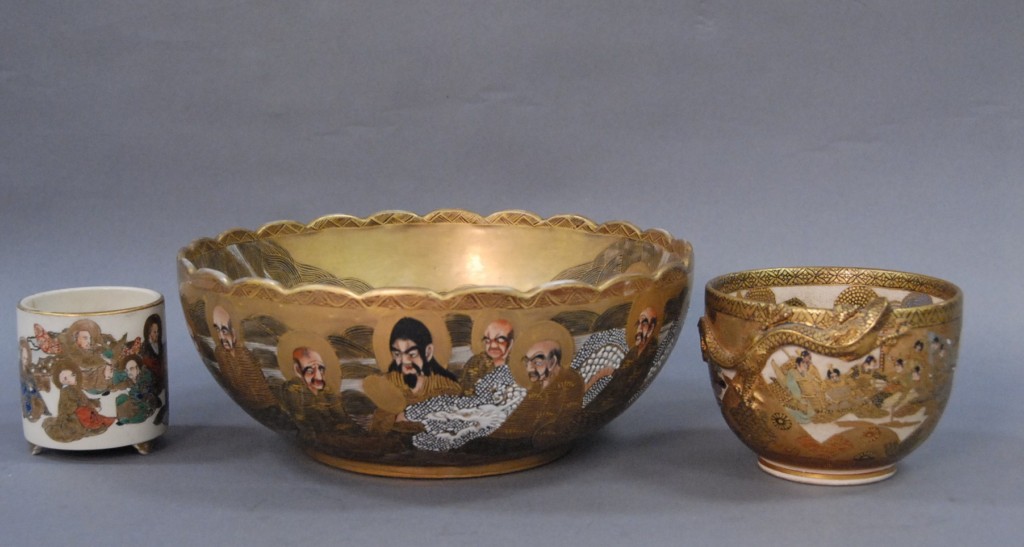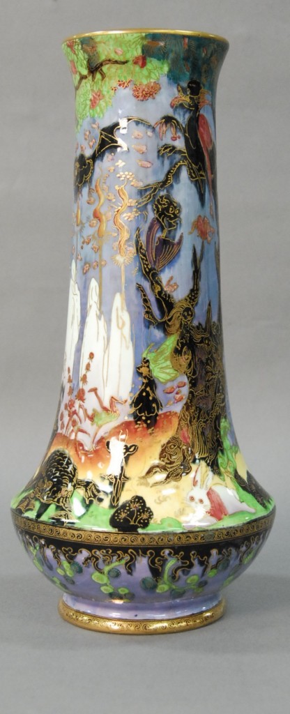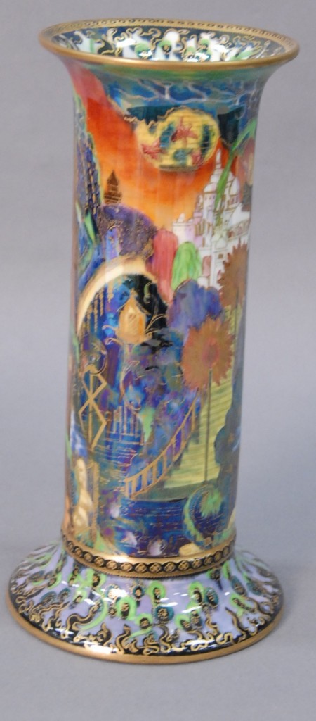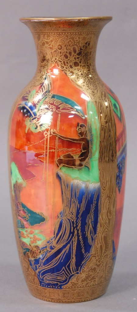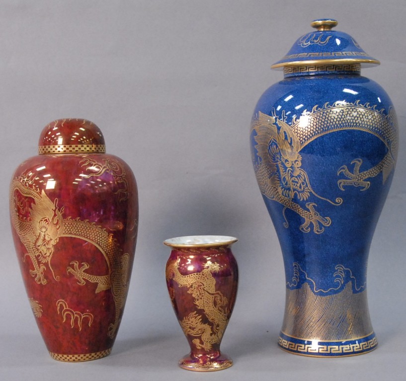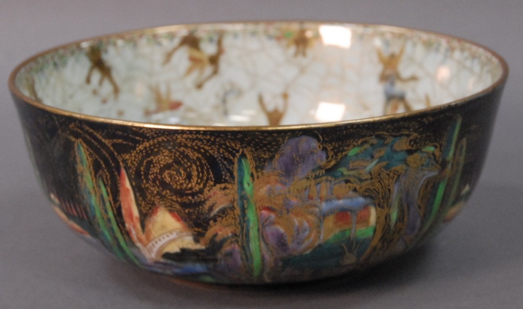 Six piece Wedgwood lot two stemmed cups, numbered Z14635 and Z4229, five Wedgwood Fairy Luster pieces a three handled cup, two tea cups, and one saucer. Largest cup height: 3in. diameter 4in.