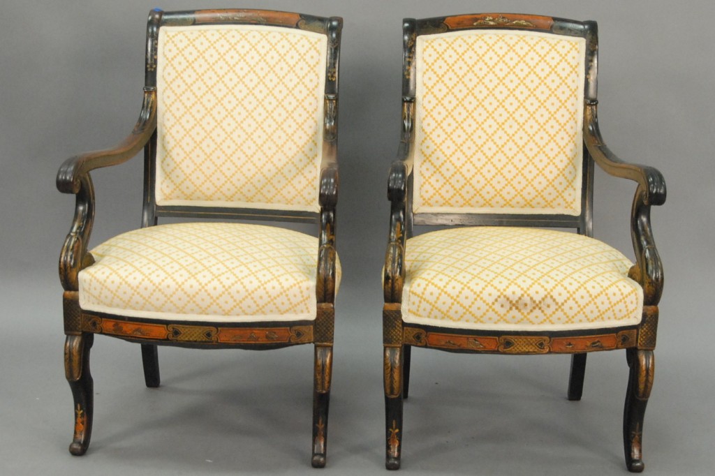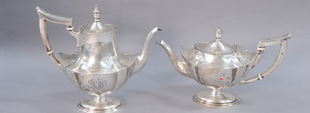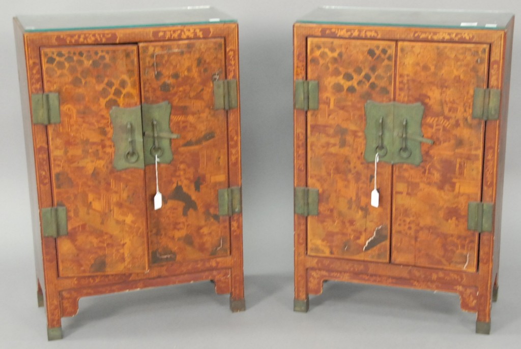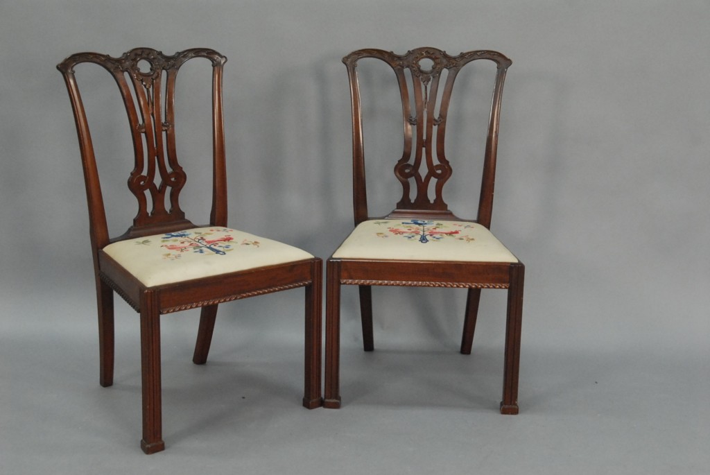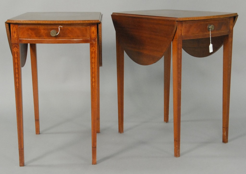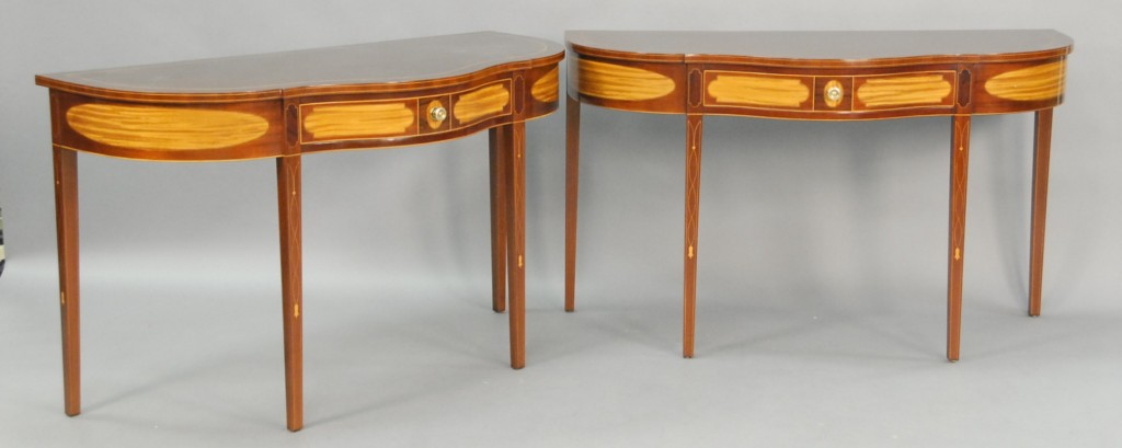 Pair of mahogany Kindel servers having shaped tops over conforming frieze with one drawer all set on square tapered legs with line and satinwood panel inlays, signed Kindel Winterthur Reproductions, excellent condition. height 33in. width 55 1/2in. depth 25in.