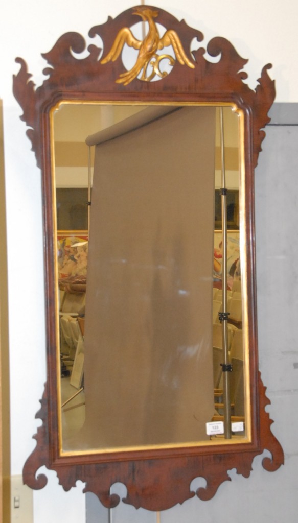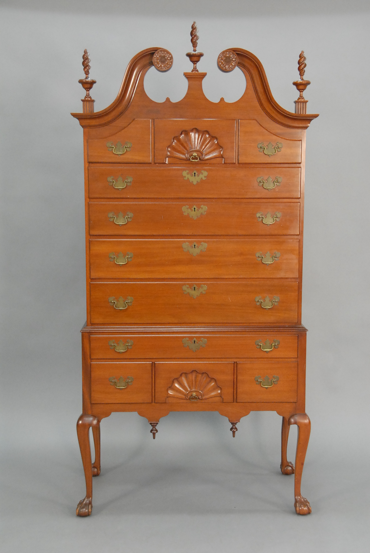 Margolis Chippendale style mahogany highboy in two parts with broken arch top on cabriole legs ending in ball and claw feet, signed Margolis. height 81in. width 36in.