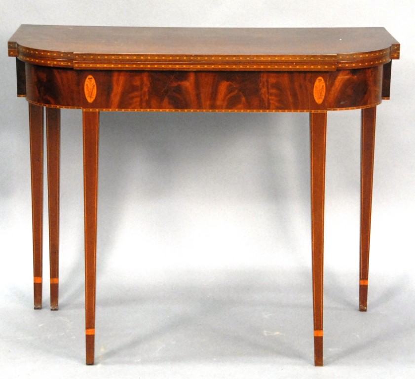 Margolis mahogany Federal style game table having D shaped top over conforming frieze, all set on square tapered legs with line and panel floral inlays, branded: Margolis 1931. height 30in. width 37in.