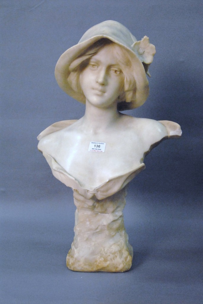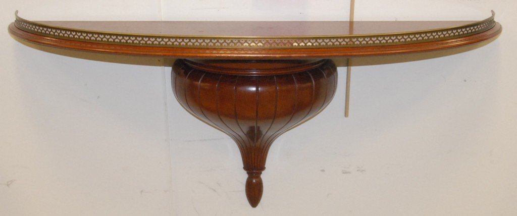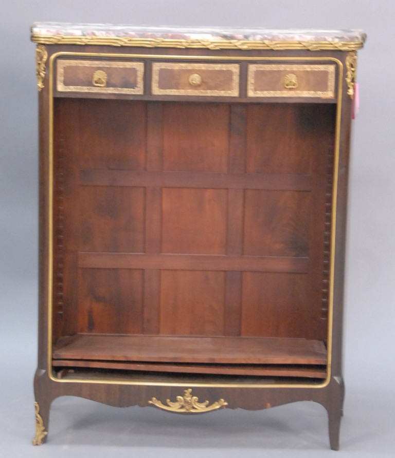 Louis XV style bookcase with rouge marble top, gilt bronze mounts, and three leather covered drawers over shelves and serpentine sides having inlay of various woods all set on cabriole legs, late 19th century crack in marble. height 39in. width 28 1/2in.