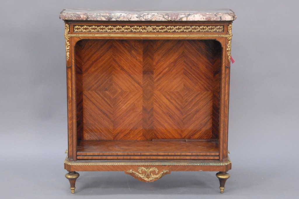 Louis XIV, 19th century bookcase with stepped rouge marble top over shelves all with bronze mounts and various wood inlays set on turned legs, 19th century. height 39in. width 29 1/2in.