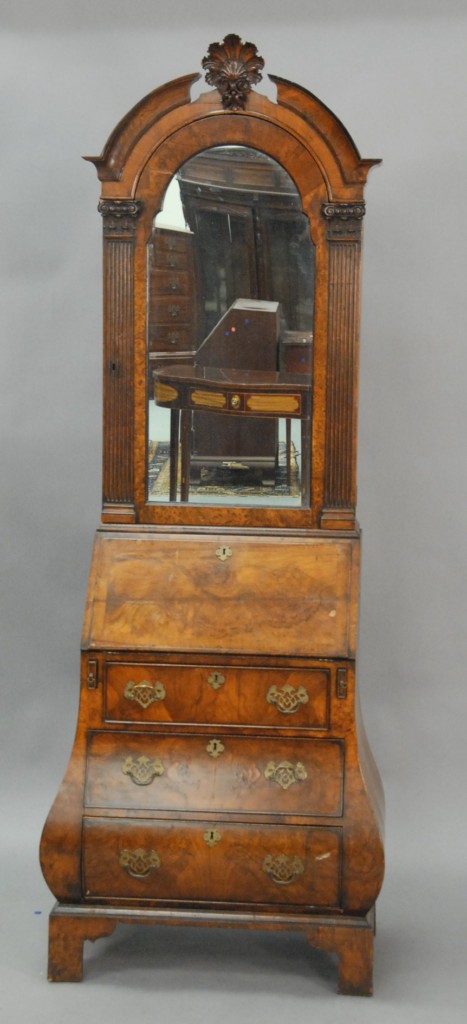 Georgian Burlwood secretary desk in two parts, upper section with domed top with shell carved finial over mirrored tombstone door on lower section with drop front desk over three drawers in Bombay form on bracket base, interior with tooled leather, 19th century. height 85in. width 25in.
