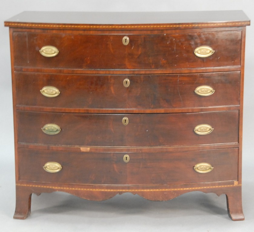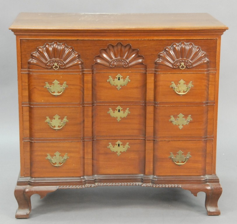 Margolis mahogany chest of four drawers with block front having triple shell carved top drawer with large brass handles, gadrooned skirt and ogee feet, branded Margolis 1930 top in need of refinishing. height 37in. width 38in.