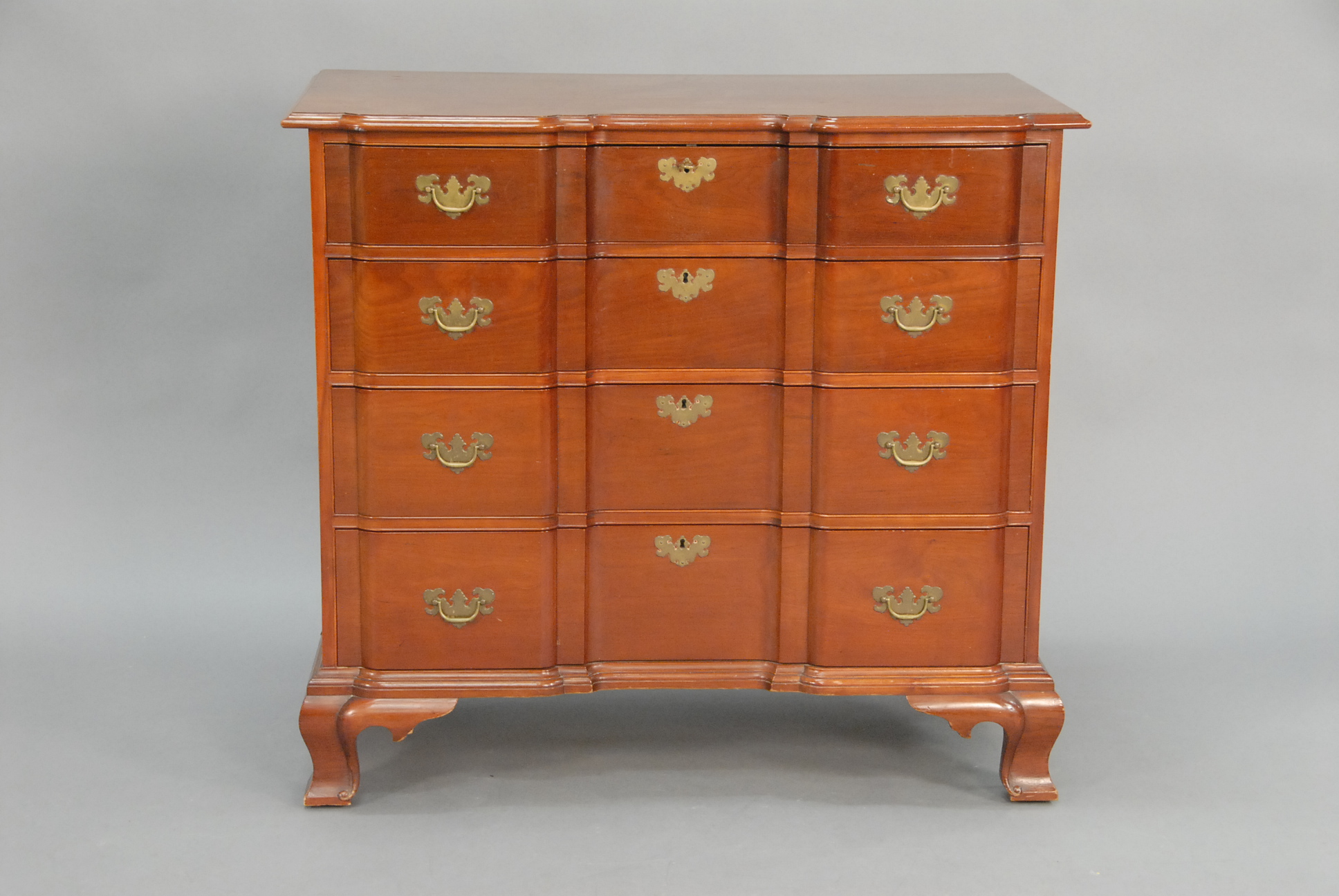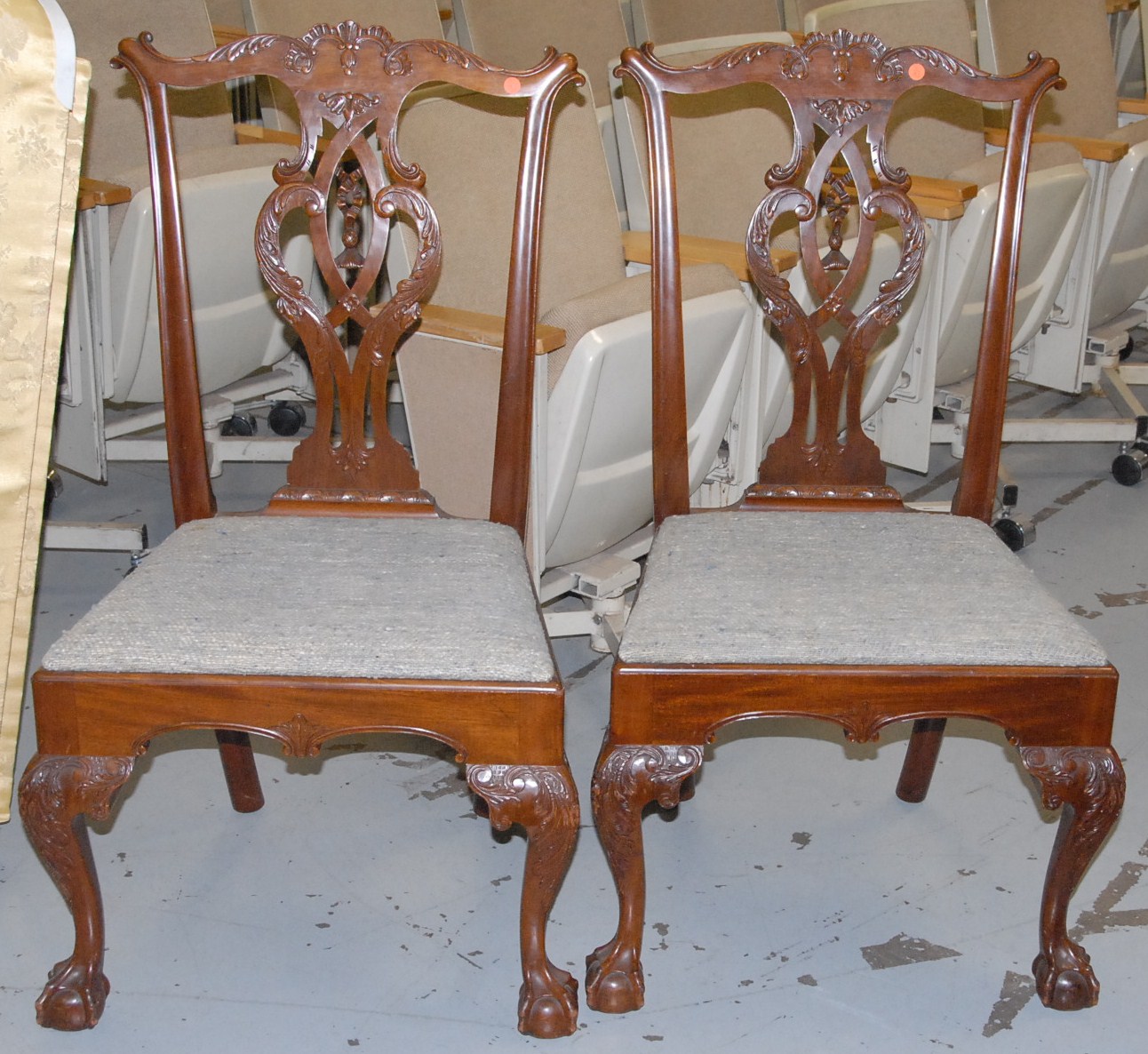Pair of Margolis Tasselback Chippendale side chairs with pierced carved backs and slip seats on carved cabriole legs ending in ball and claw feet, branded Margolis.