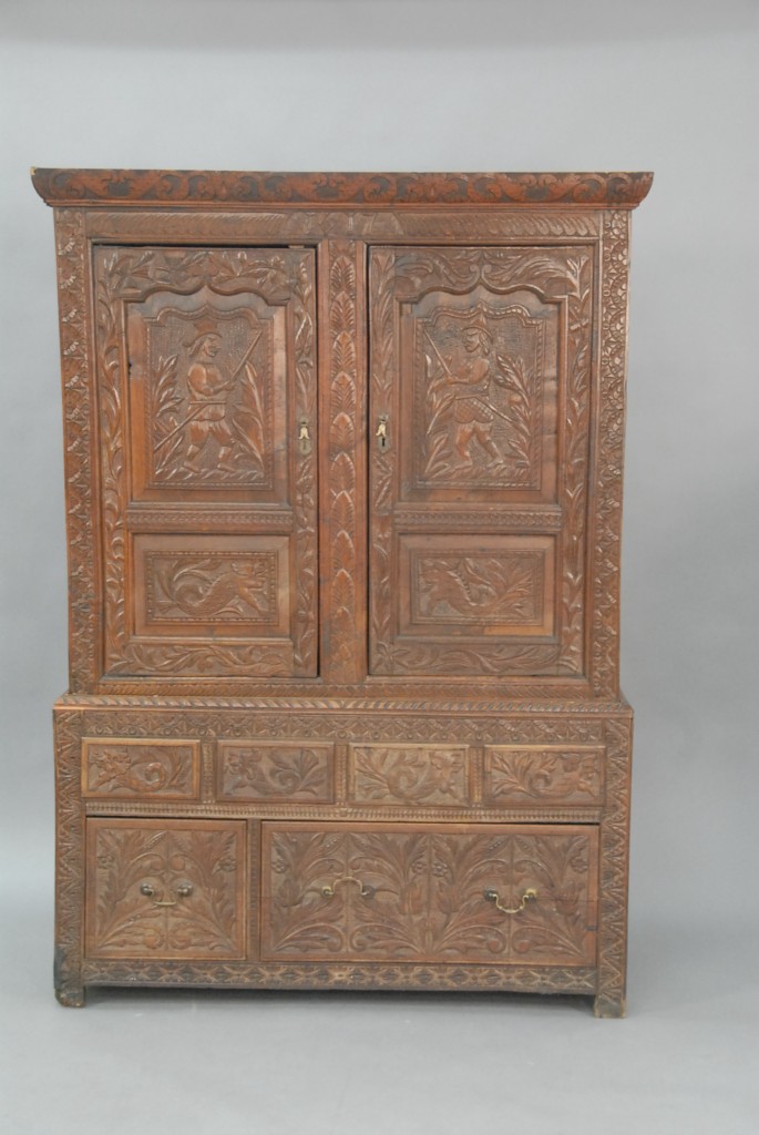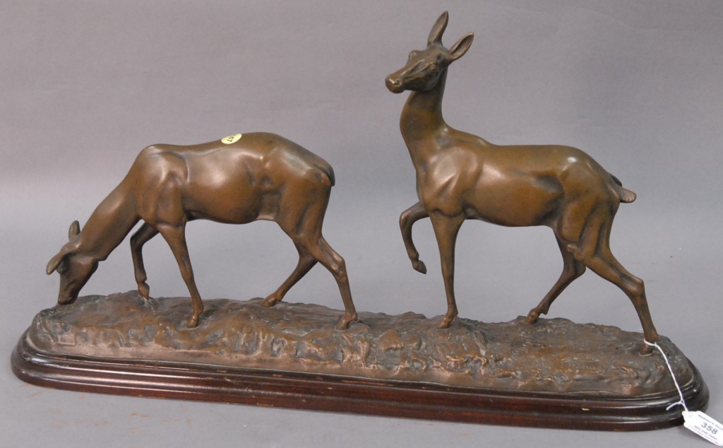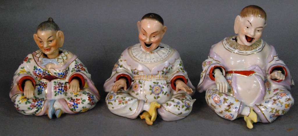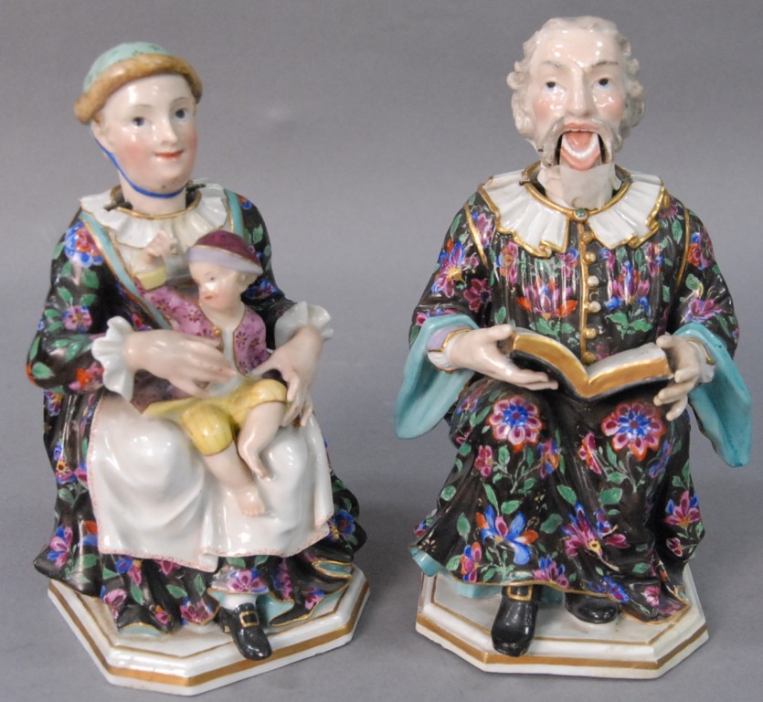 Pair of Meissen nodders of a preacher and his wife, probably 18th – 19th century, he is reading a book and she is holding a child on her lap, each resting on hexagonal base marked with four crossed swords crack, repair, and minor chips. Height 7 3/4in.