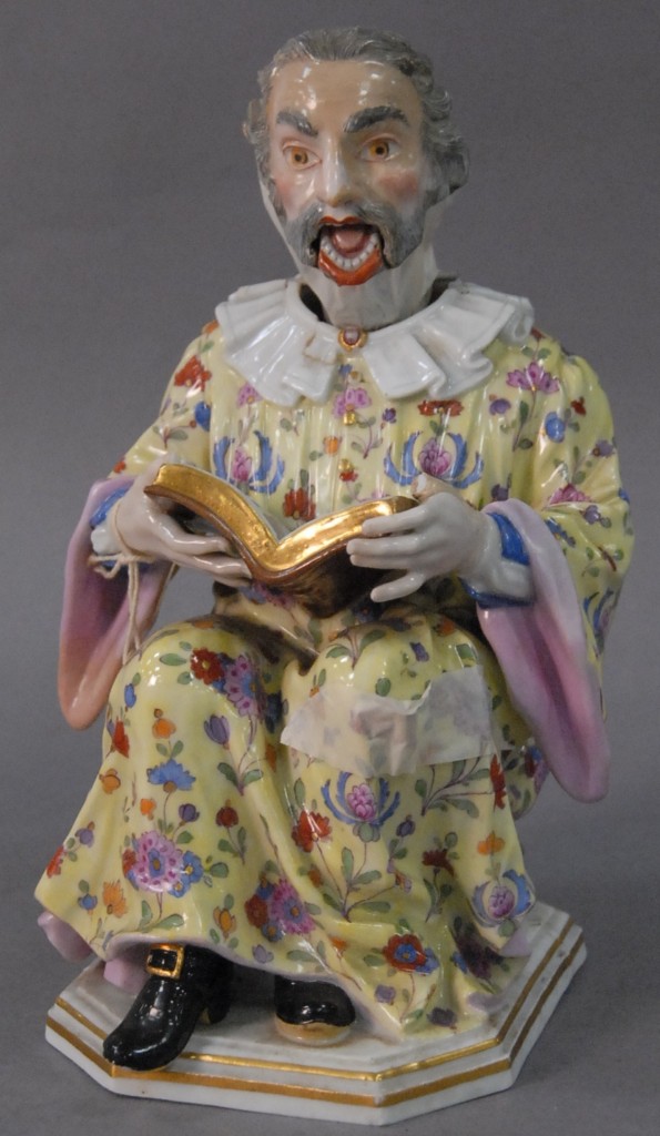 Meissen figure of a nodding bearded scholar reading a book, probably late 19th century with blue crossed swoards incised 2187 minor chips and small repair. Height 8in.
