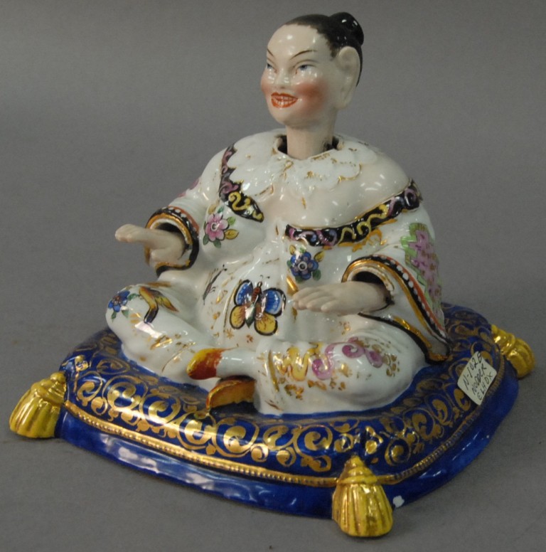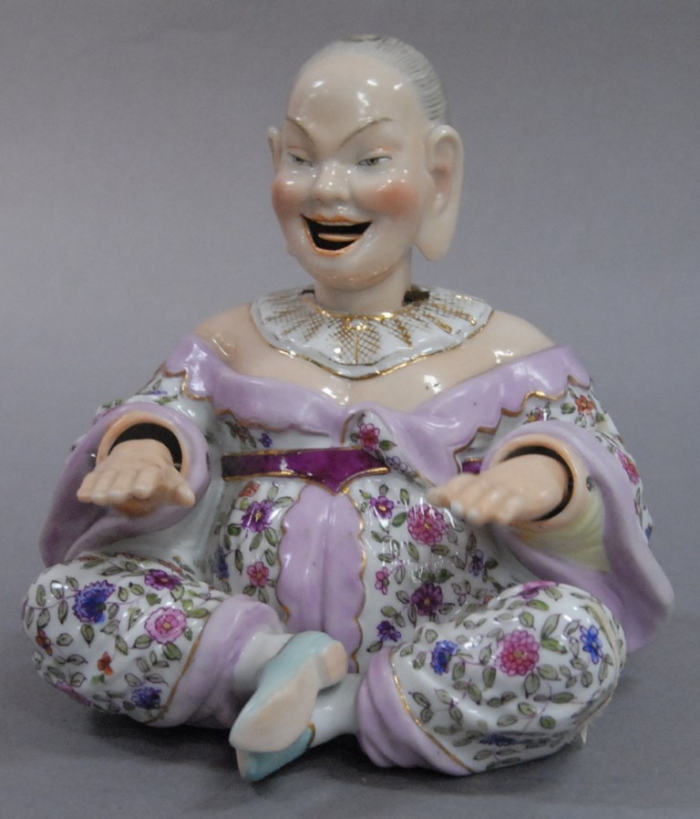 German porcelain nodding Pagoda figure Rudolstadt Ernst Bohne Sohne, depicting male figure and having moving tongue head and hands with underglazed blue anchor mark, with paper sticker Wm Doyle 11/2/77 small chip. Height 6in.
