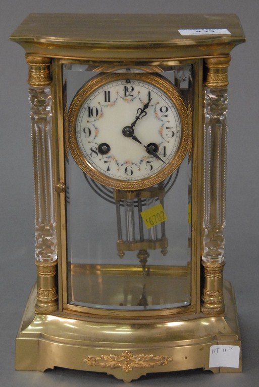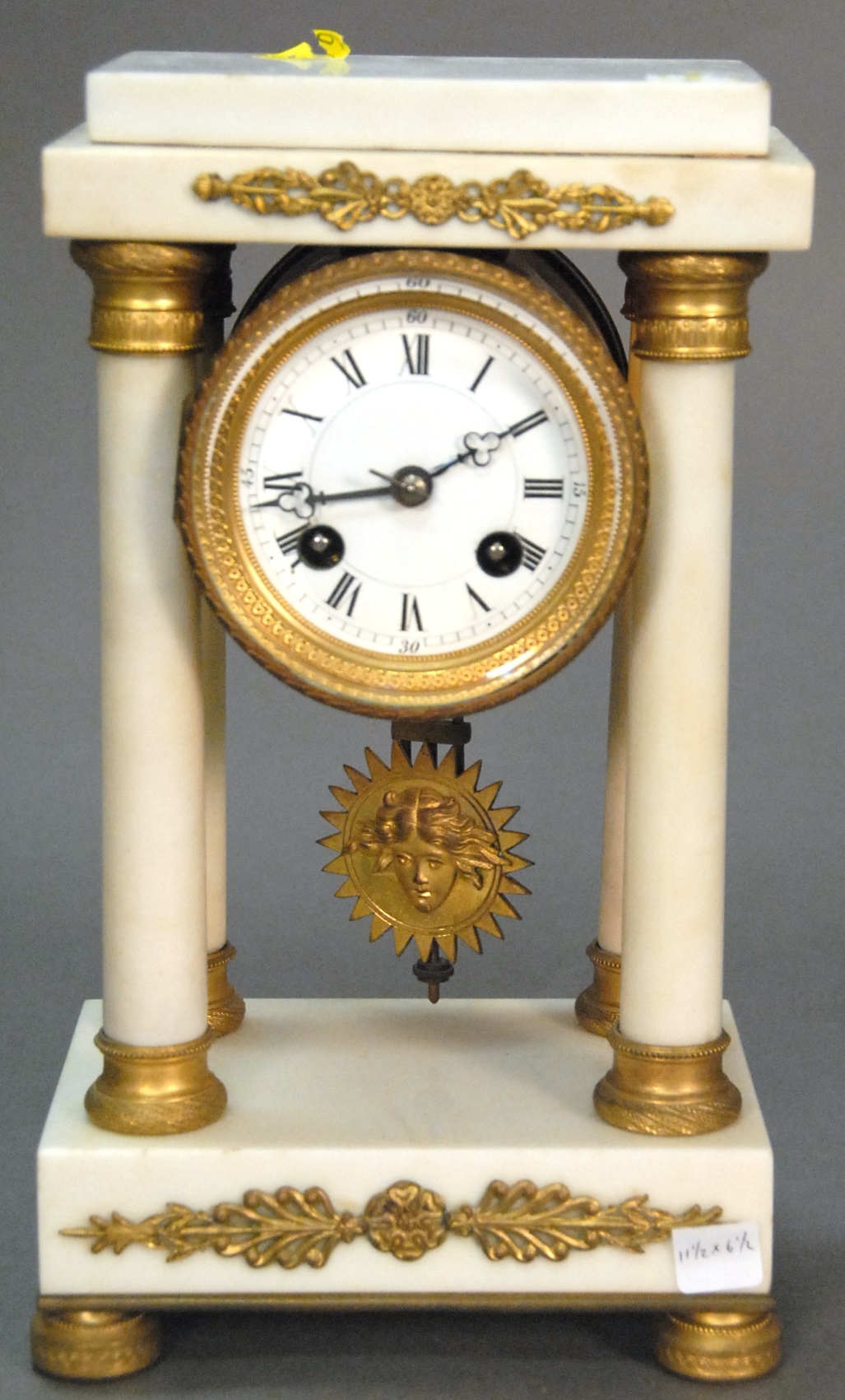 French marble pier clock with enamel face and applied ormolu decoration, in working order with key, circa 1825-1830. ht. 11 1/2in. Provenance: From prominent Woodbridge, Connecticut family collection.