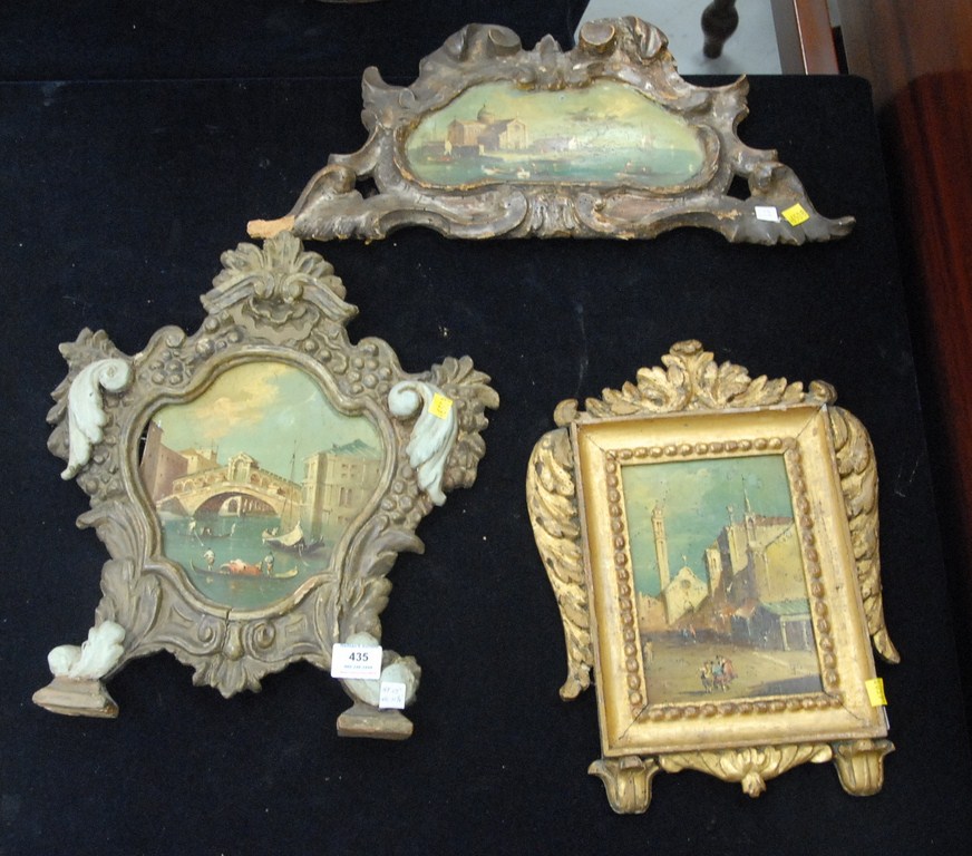 Three small Venetian paintings on wood panels in carved wood frames, probably 18th century. Provenance: property from a home in Rockville Center, New York which was decorated by Iris Apfel. 17 x 14 1/2 15 1/2 x 12 9 1/2 x 22