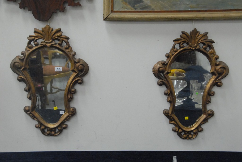 Pair of Venetian style mirrors in carved gilt wood frames with wooden backs sculptured with shells, leaves and floral swirls in the rococo style, 19th century. Provenance: From prominent Woodbridge, Connecticut family collection. ht. 26in. wd. 17in.