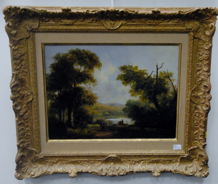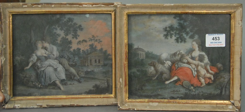 Two 18th century paintings Manor of Jean Antoine Watteau 1684-1721 FRENCH GENRE SCENES OF MEN AND WOMEN IN THE COUNTRY oil on paper 7 x 8 Provenance: From prominent Woodbridge, Connecticut family collection.