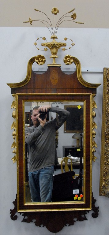 Margolis mahogany Federal style mirror with gilt urn of flowers in top flanked by gilt pediment with panel and line inlaid frame. Provenance: Estate of Judy McDonough Gengras of Stoner Drive, West Hartford, Connecticut. ht. 57in.