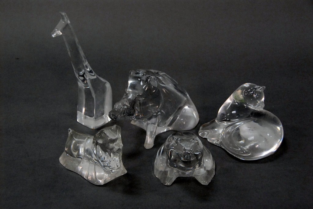 Collection of Baccarat crystal animals giraffe, reclining cat, frog, dog, and wild boar. Provenance: From prominent Woodbridge, Connecticut family collection. ht. of tallest 8in.