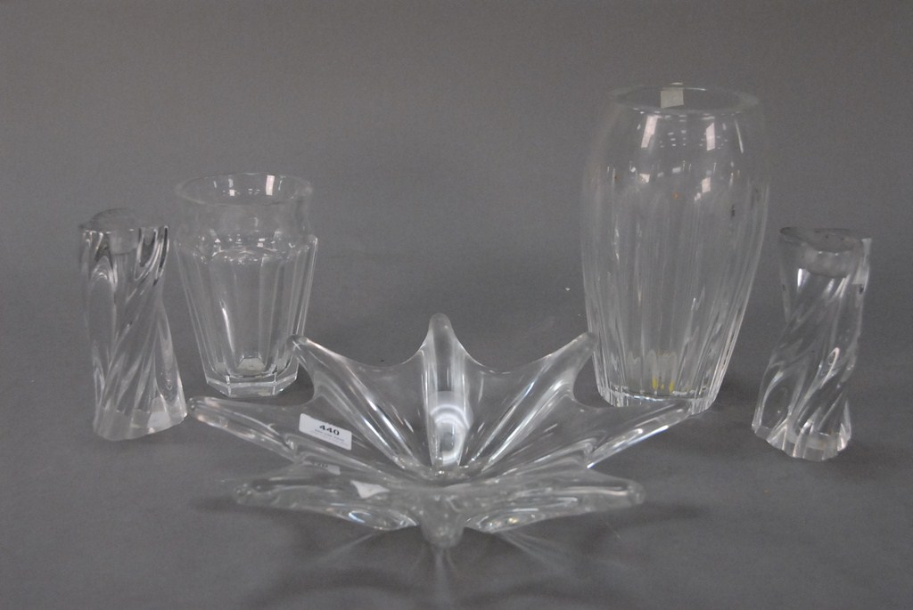 Five piece Baccarat lot two vases, pair of candlesticks, and starfish crystal bowl. Provenance: From prominent Woodbridge, Connecticut family collection. ht. of tallest 10in.