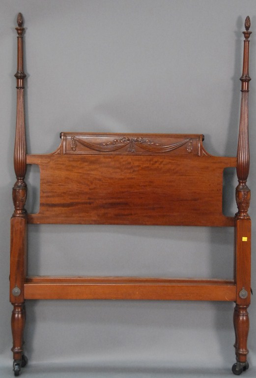Pair of Margolis twin beds with tall front posts fluted and drape carved, headboards carved with swag and drapes, footboards low posts, signed Margolis with brand mark Harold Margolis. ht. 63 1/2in. wd. 42in.