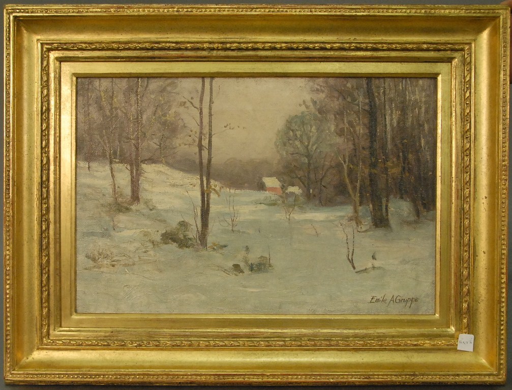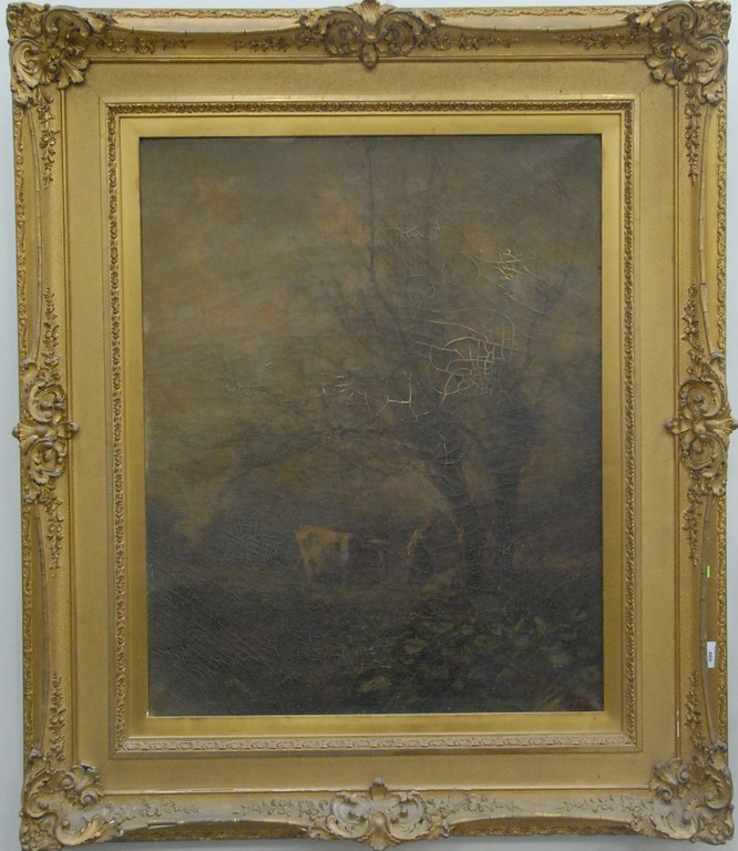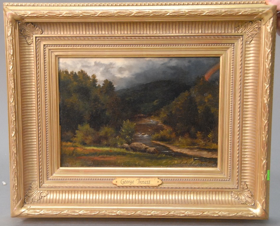 George Inness American 1825-1894 THE RAINBOW oil on artist’s board initialed lower left G.I. Provenance: Barridoff Galleries, South Portland, Maine, August 3, 2007, no 232 to Private Collection, Savannah, Georgia. 9 1/4 x 13 1/8 Painting comes with letter from Michael Quick, the writer of the catalgue raisonne of the works of George Inness. In this letter, he comments that The Rainbow presents a dramatic scene of a storm deep in the mountain wilderness. Beyond the grassy immediate foreground, light strikes rocks in the center and low trees on the left. Farther back on the left, tall trees rise on a slope. In the middle ground on the right, light strikes the bank of a stream and the bushes near it. Behind them rise tall trees in front of a steeply rising forested slope. Flowing out of the center distance, a shallow brook meanders through the middle distance and passes over rapids, before veering toward the right and the lower right corner. Over the brook and between the facing slopes at either side can be seen a distant mountain, forested on its lower slopes, its top partially hidden in cloud. In the heavily clouded sky, a storm is clearing off toward the right, leaving the partial arc of a rainbow in the upper right. he goes on to say that Having carefully studied The Rainbow over a period of time, it is my definite opinion that The Rainbow is an authentic painting by George Inness 1825-1894. I intend to publish The Rainbow in the supplement to my catalogue raisonne of the works of George Inness.