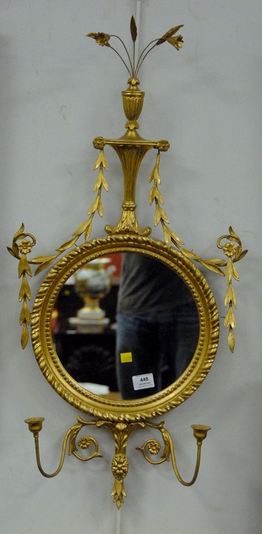 Pair of Fineberg gilt girandole mirrors, round flat glass having gilt urn tops with leaf and vine designs, and two candle holders. ht. 36in. Provenance: Hoffman Estate sold by Nadeau’s Auction Gallery to present owner