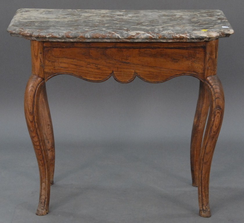 Louis XV provincial fruitwood low table with a rectangular scalloped grey marble top above a carved apron raised on cabriole legs, restored 18th – 19th century. Provenance: From prominent Woodbridge, Connecticut family collection. ht. 28in. top: 16 x 31.