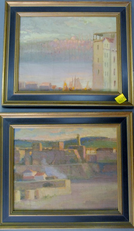 Two unsigned Orientalist 19th century oil on canvas studies of Constantinoplein cluding Hagia Sofia Mosque and the Black Sea the pair framed. 7 x 9 each Provenance: From prominent Woodbridge, Connecticut family collection.